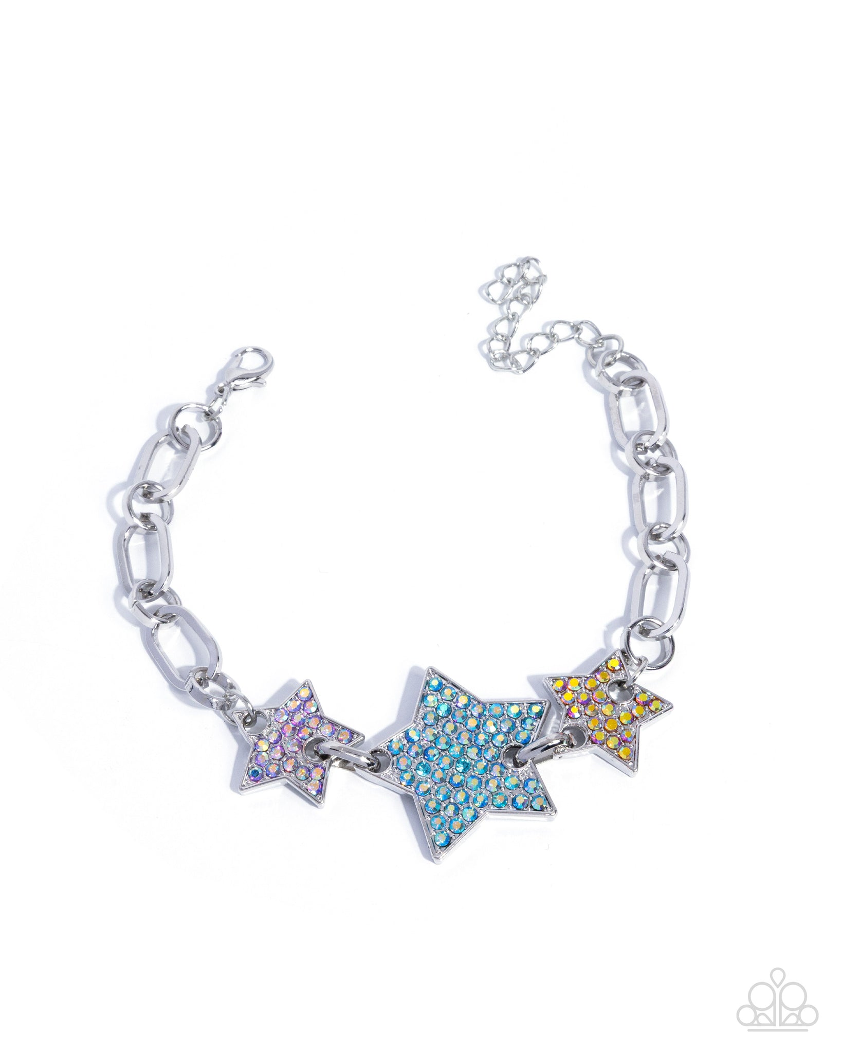 Embellished in aquamarine iridescent, violet iridescent, and topaz iridescent rhinestones, a trio of varying sizes of silver stars meets at the center of the wrist along an abstract silver chain for a cosmically chic display. Features an adjustable clasp closure. Due to its prismatic palette, color may vary.
