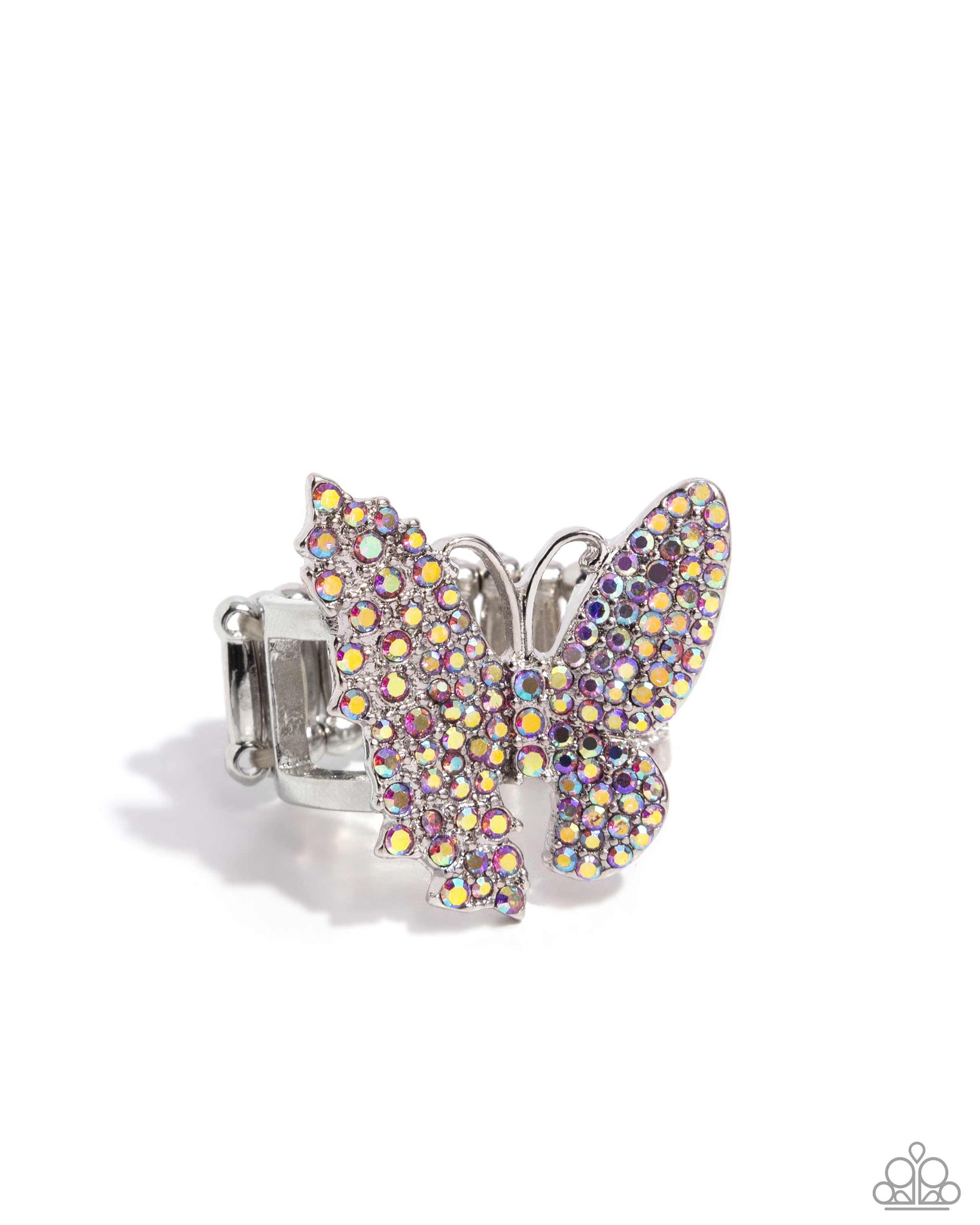 Featuring exaggerated studded and sharp detail on its left wing, a silver butterfly, embellished with pink iridescent rhinestones, flutters atop airy silver bands for a royally whimsical centerpiece. Features a stretchy band for a flexible fit. Due to its prismatic palette, color may vary.