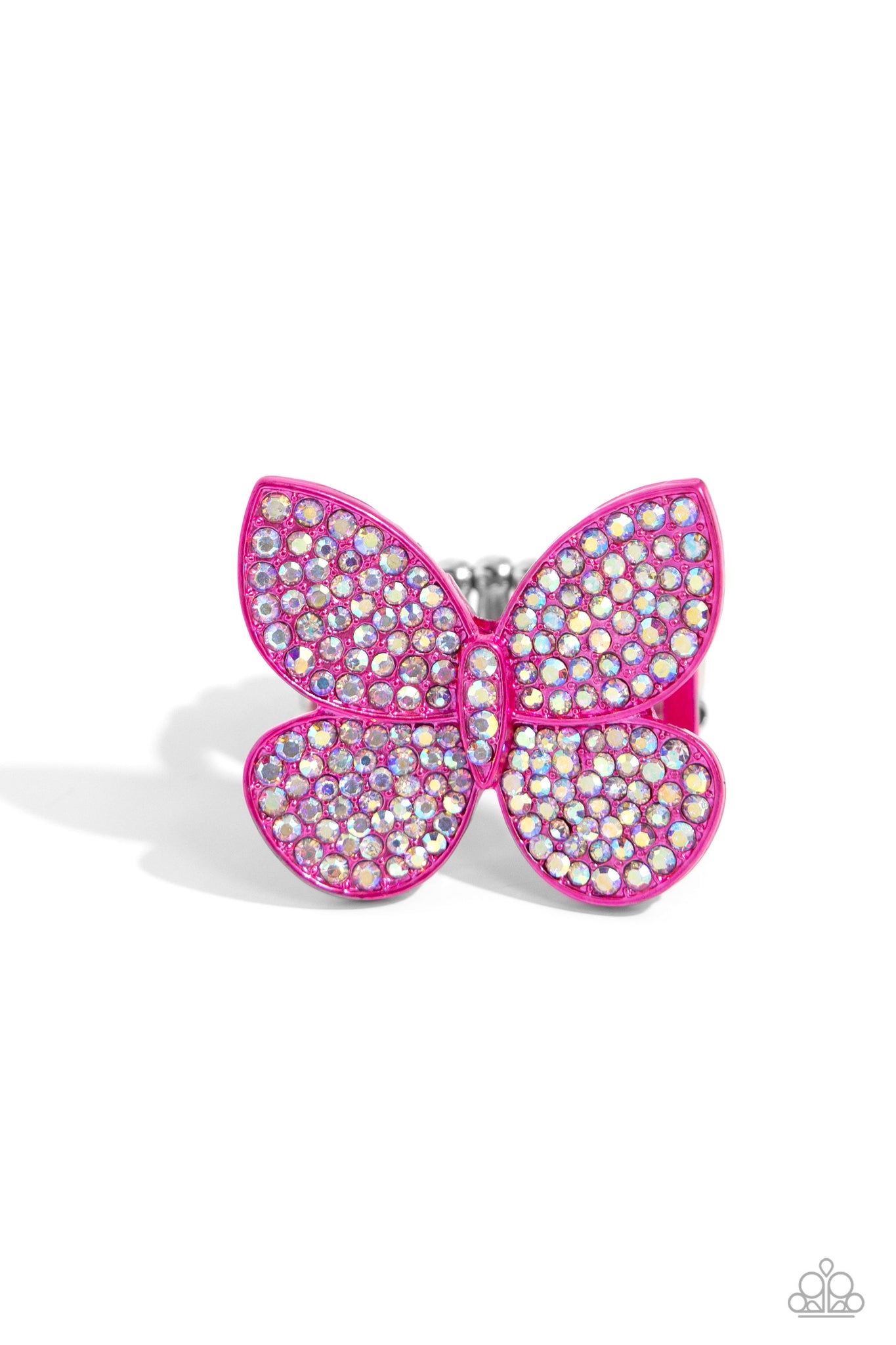 Featuring a surface of iridescent rhinestones, an electric pink butterfly flutters atop the finger for a magically whimsical statement. Features a stretchy band for a flexible fit. Due to its prismatic palette, color may vary.