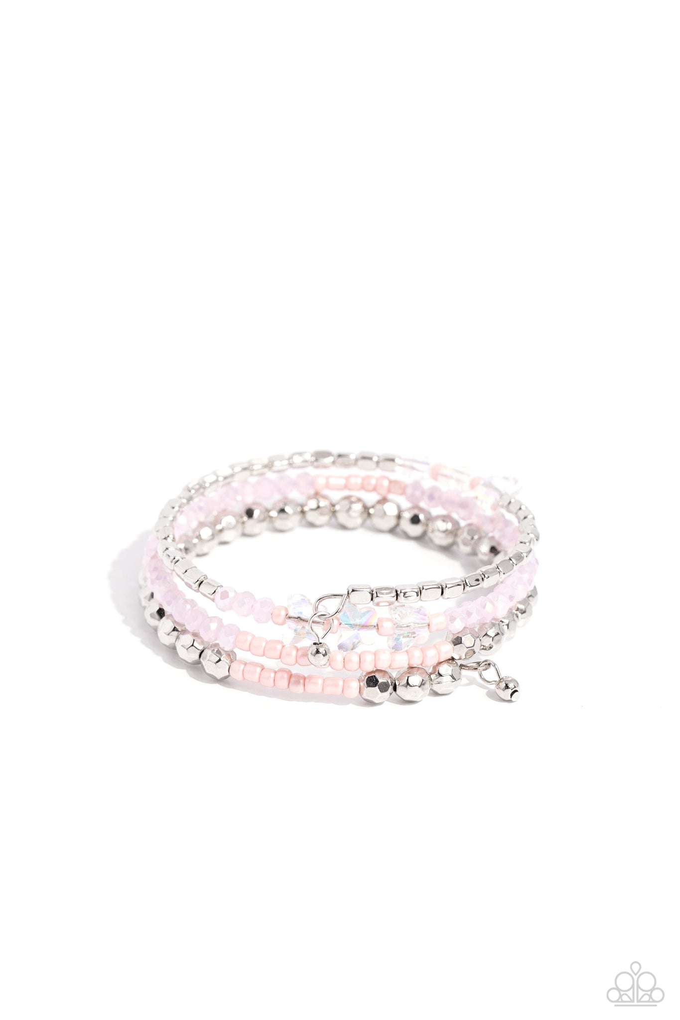 Faceted silver beads, pink seed beads, faceted pink beads, and pink iridescent butterfly beads are threaded along a wire that coils around the wrist, creating a whimsical infinity wrap style bracelet. Due to its prismatic palette, color may vary.