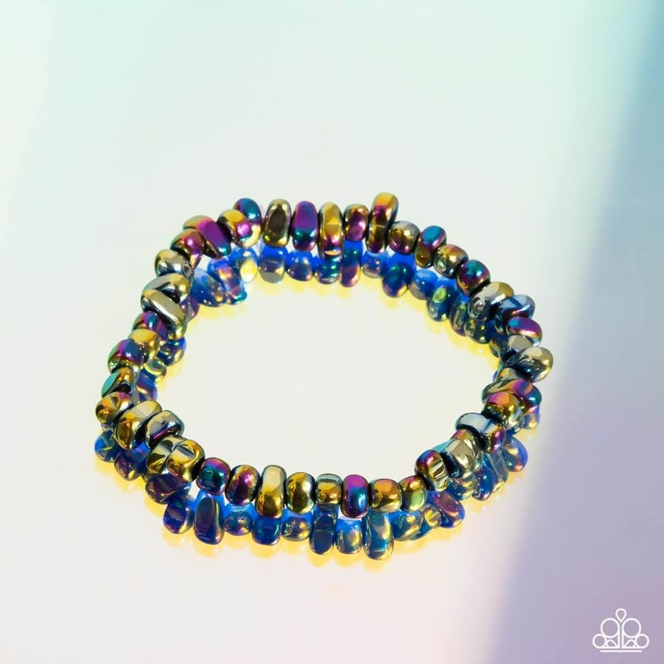 Brushed in a multicolored pastel shimmer, a collection of oil spill pebble beads are infused along an elastic stretchy band around the wrist for a colorfully charming look.