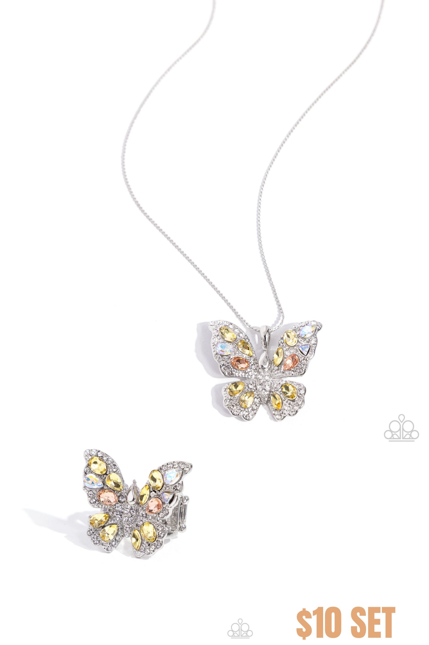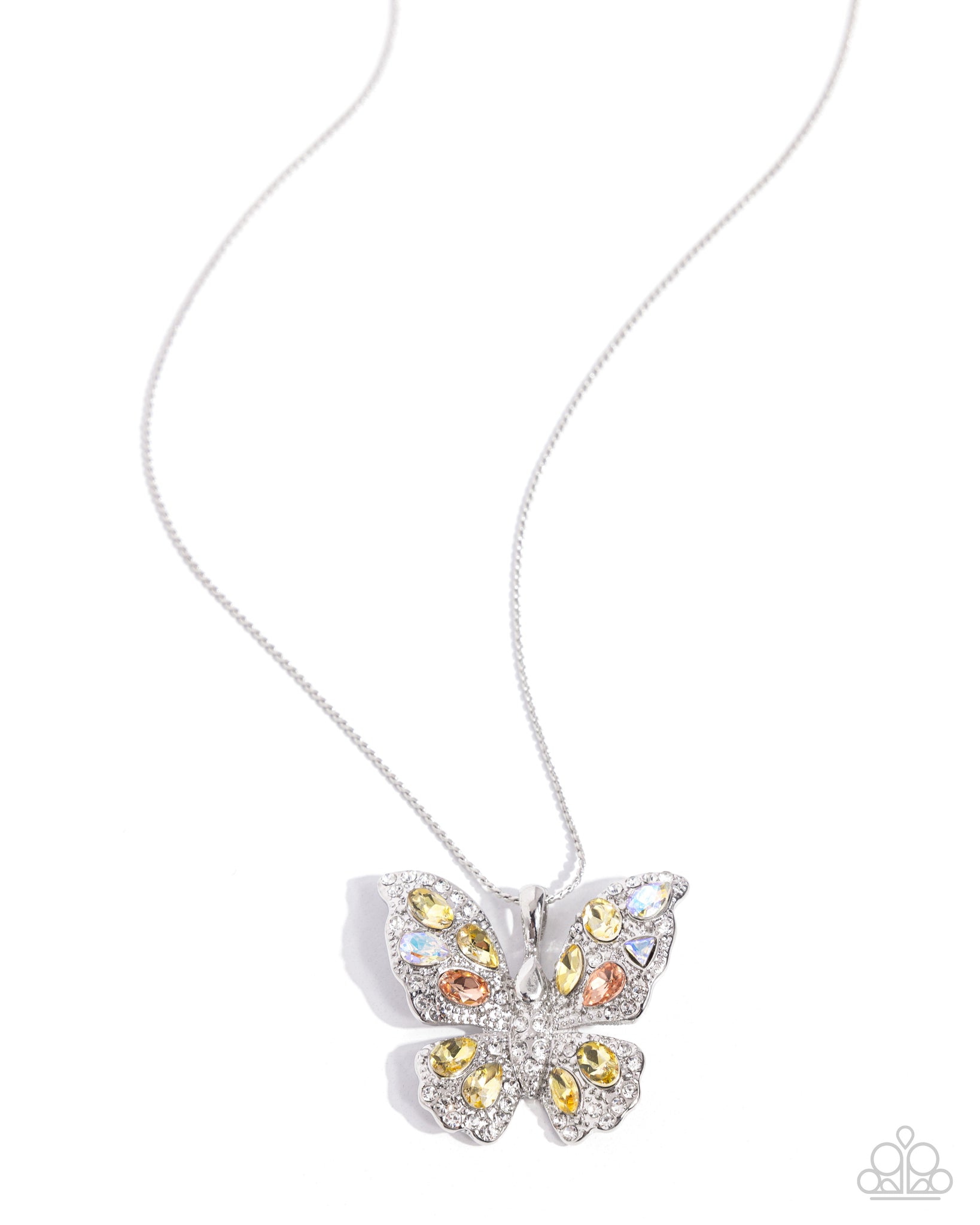 NECKLACE: Dotted with glittery peach, yellow, and yellow UV gems in varying cuts, an oversized silver butterfly frame radiating with white rhinestones swings from the bottom of a lengthened twisty silver chain for a whimsical look. Features an adjustable clasp closure.