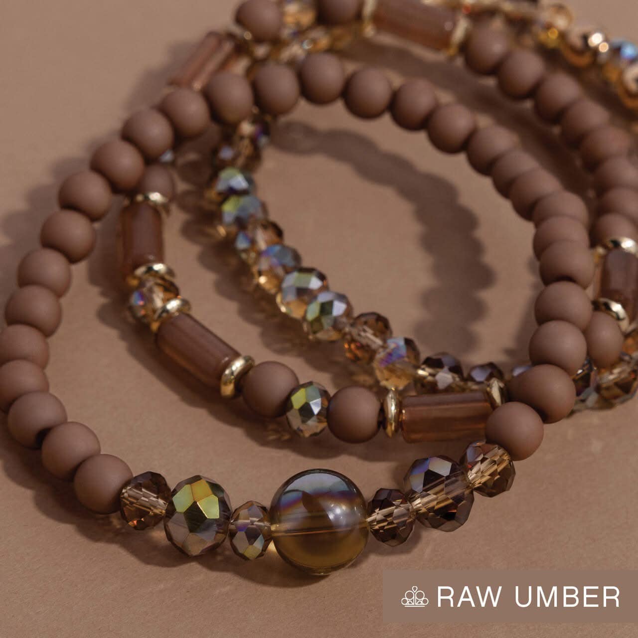A collection of smooth warm brown beads, iridescent faceted topaz beads, and brown cylinder accents are threaded along three stretchy bands, creating a layered design. A striking brown metallic bead stands out among the varying textures and shapes.