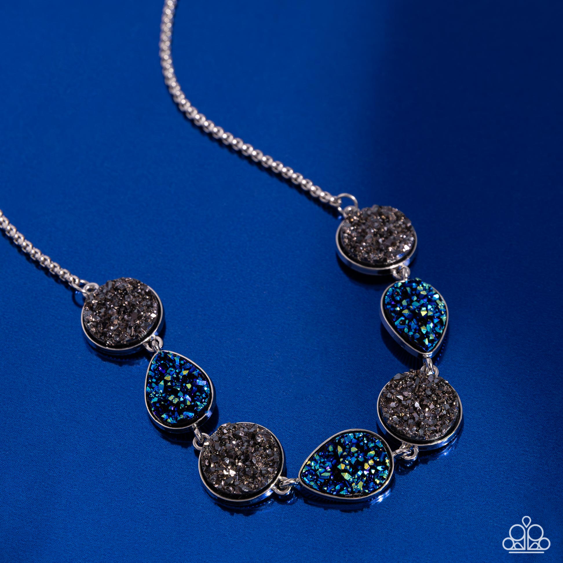 Featuring blue oil spill and hematite druzy-like accents, round and teardrop silver frames alternate from a rounded box chain down the neckline for a jaw-dropping finish. Features an adjustable clasp closure. Due to its prismatic palette, color may vary.