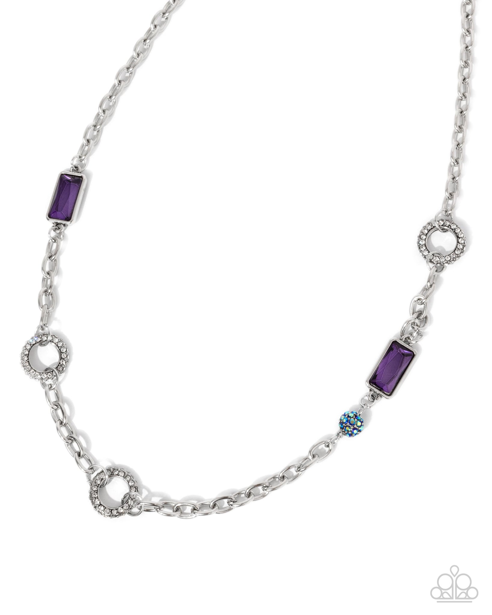 Infused along a glistening silver cable chain, a collection of white rhinestone-bordered wreath-inspired links, emerald-cut purple gems pressed in silver frames, and an amethyst iridescent rhinestone-dotted silver ornament pattern below the neckline for a radically radiant display. Features an adjustable clasp closure. Due to its prismatic palette, color may vary.