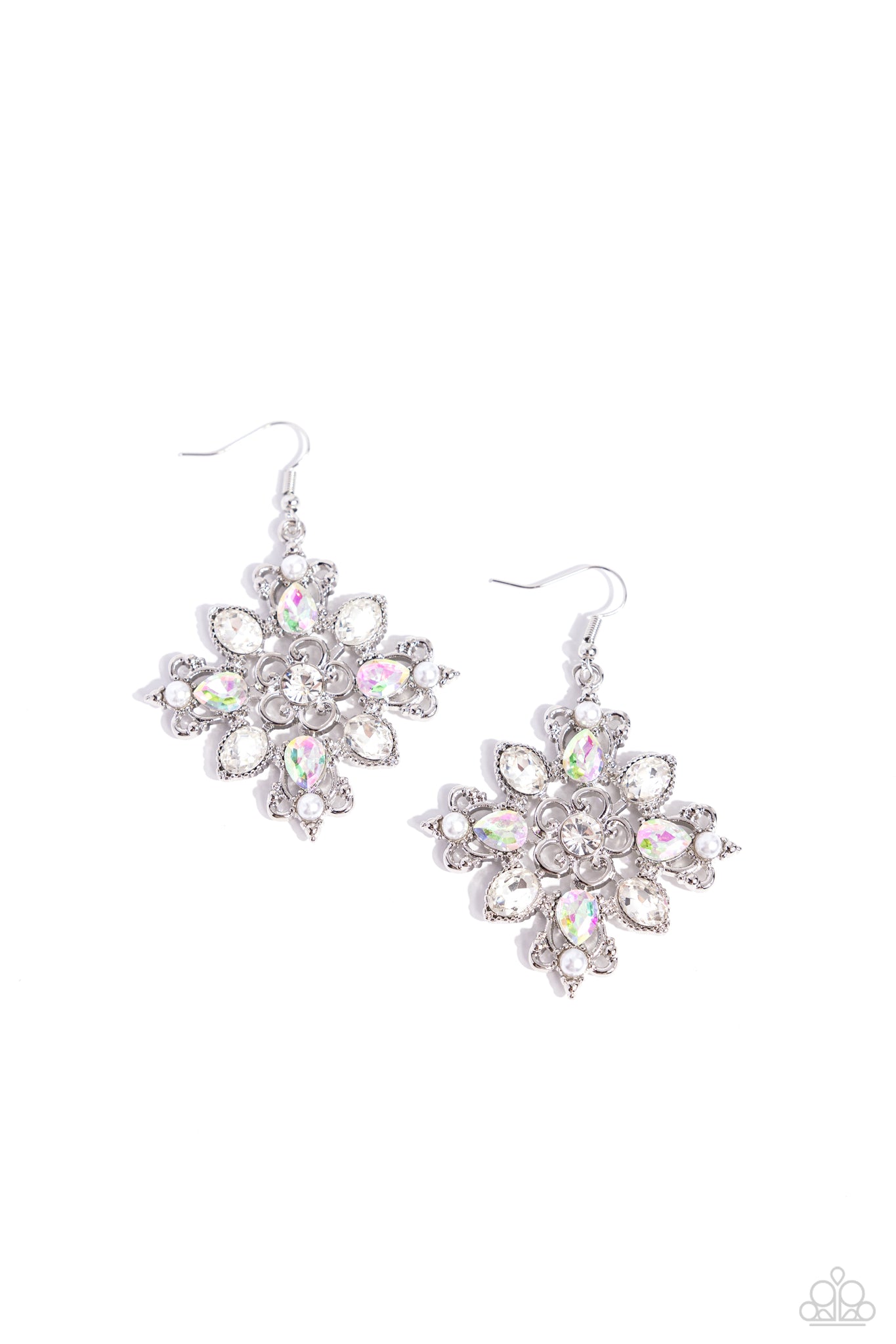 White pearls, UV shimmery, and white teardrop gems are pressed into a shiny silver floral filigree centerpiece. Each shimmery and glossy accent shimmers and blooms around a white gem center for an eye-catching statement. Earring attaches to a standard fishhook fitting.