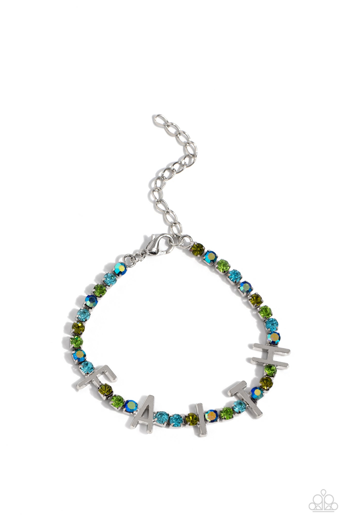 Set in silver square fittings, various multicolored rhinestones gleam around the wrist. Infused along the design, sleek silver letters spell out the word "FAITH" for an inspirational finish. Features an adjustable clasp closure. Due to its prismatic palette, color may vary.