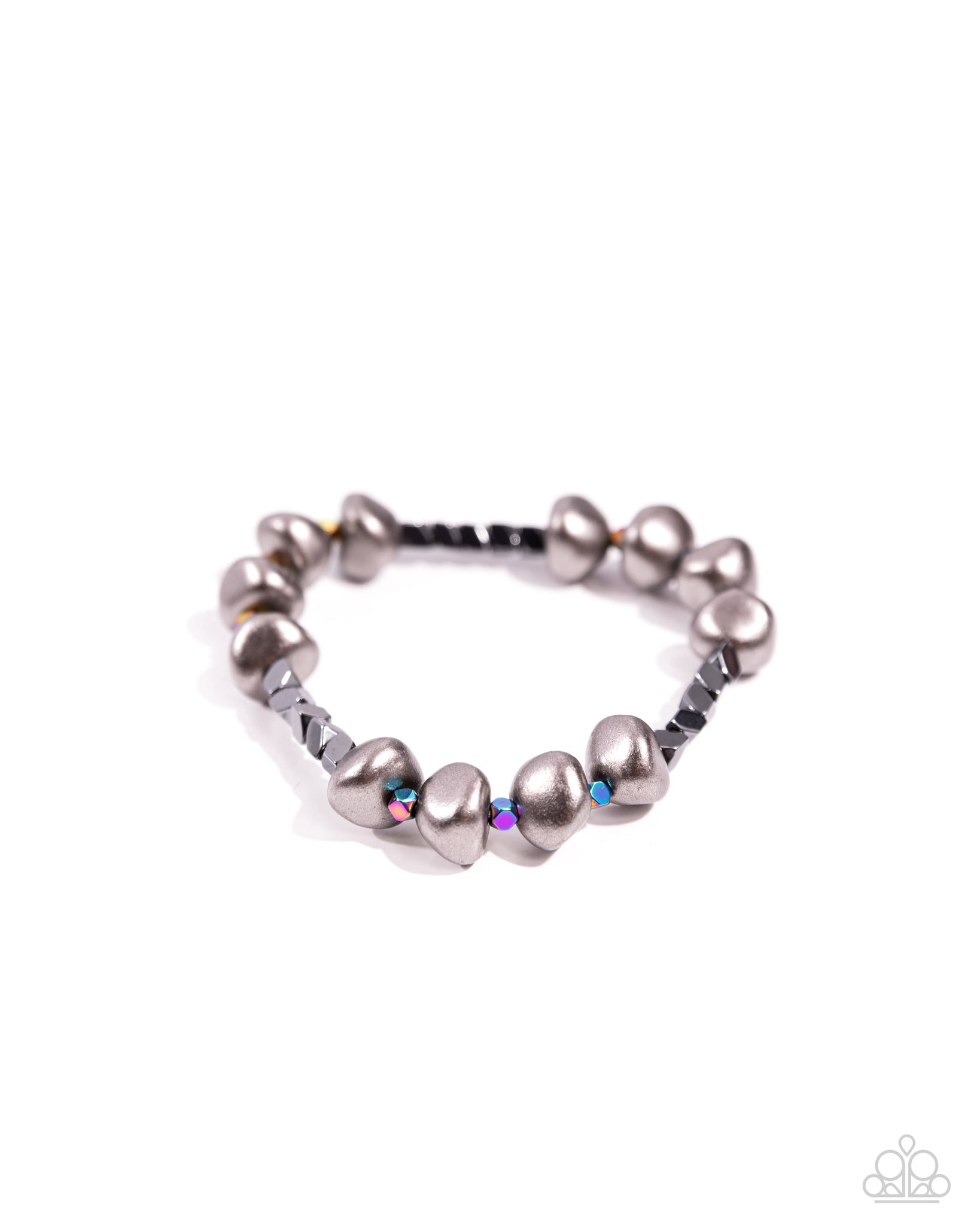 Infused along an invisible string, chiseled gunmetal beads, gunmetal-brushed pebbles, and oil spill beads flicker and flash along the wrist for an urban display.