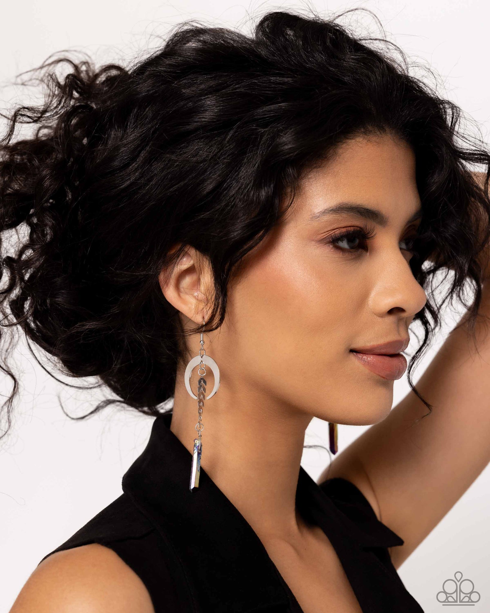 Delicately cascading from a silver laurel chain, a chiseled oil spill dipped stone swings from the bottom of a shiny silver crescent-shaped hoop, creating a seasonal lure. Earring attaches to a standard fishhook fitting.