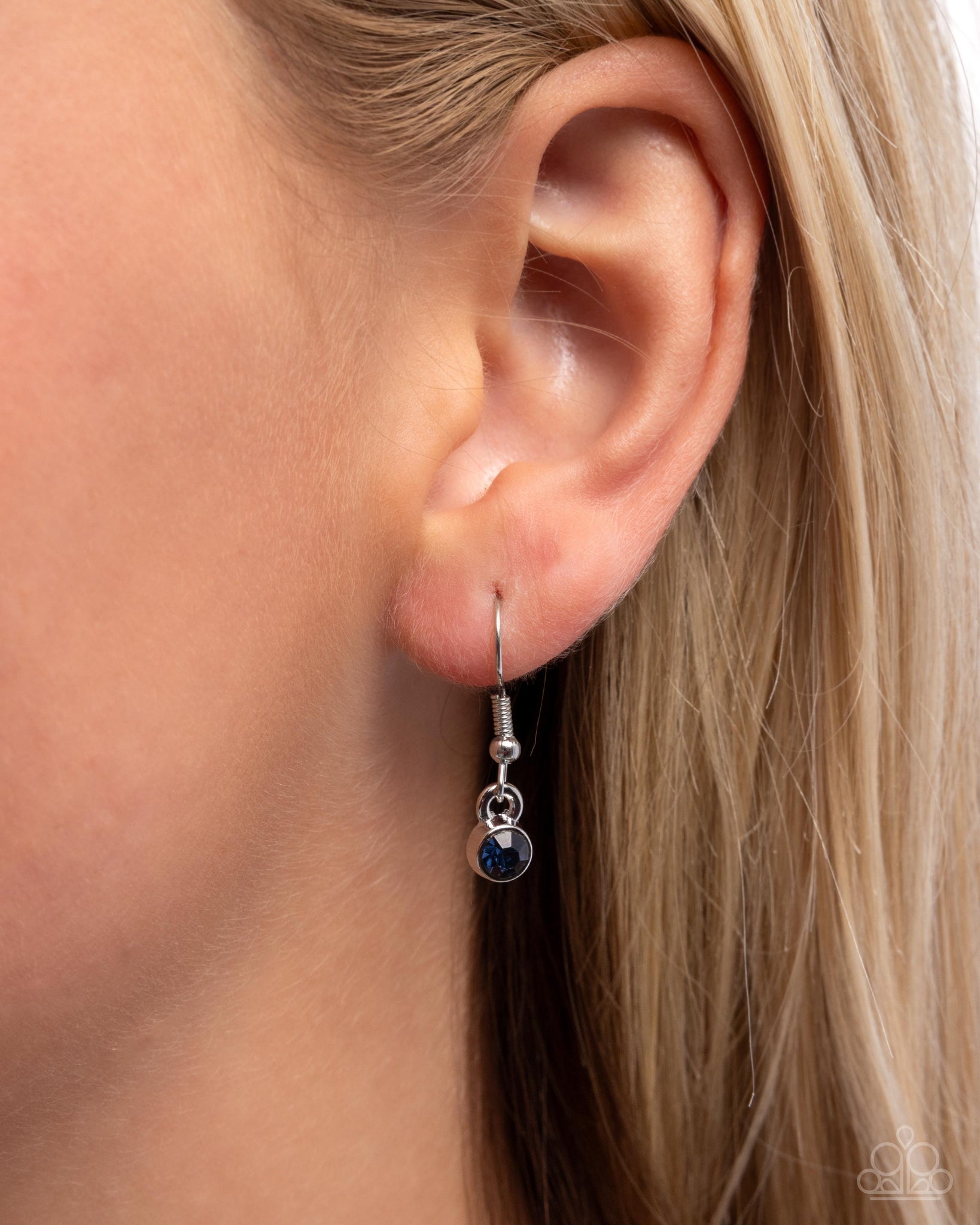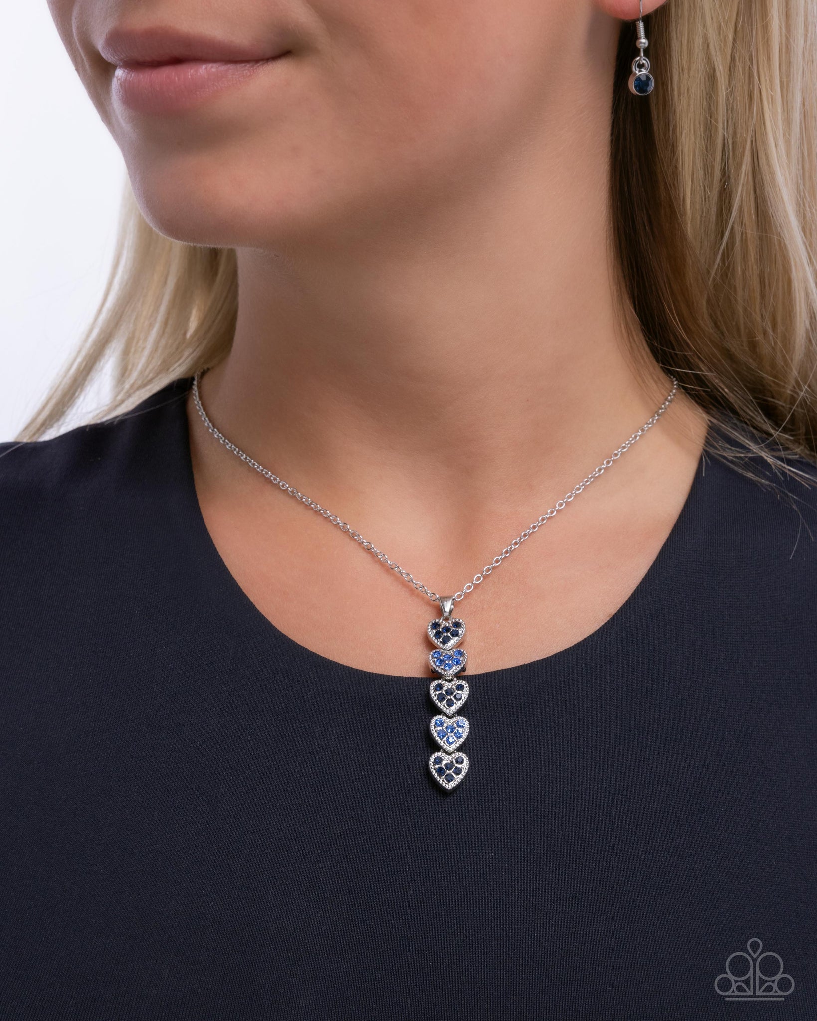 A silver chain features a vertical pendant of heart-shaped frames, alternating between Montana and Light Sapphire rhinestones. Features an adjustable clasp closure.