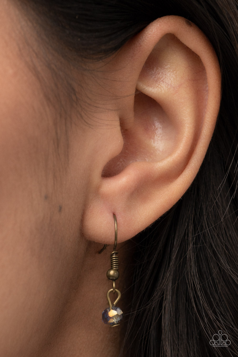 Sections of aurum and iridescent crystal-like beads embellish strands of dainty brass beaded chains, resulting in prismatic layers across the chest. Features an adjustable clasp closure.