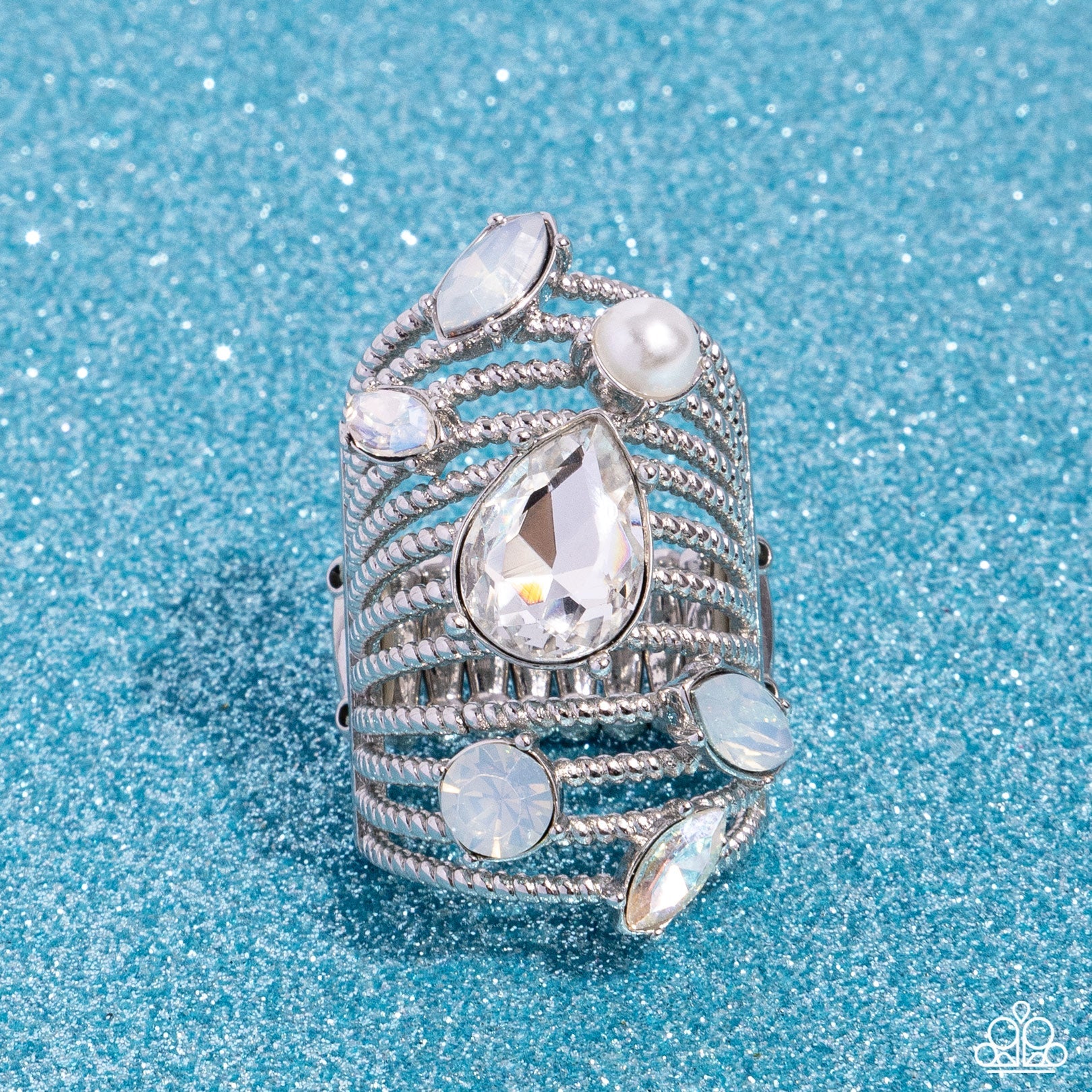 Featuring a dazzling array of round, teardrop, and marquise-cut gems, pearls, and rhinestones in multicolored white hues, row after row of twisted silver bands stack up and across the finger for a knockout look. Features a stretchy band for a flexible fit.