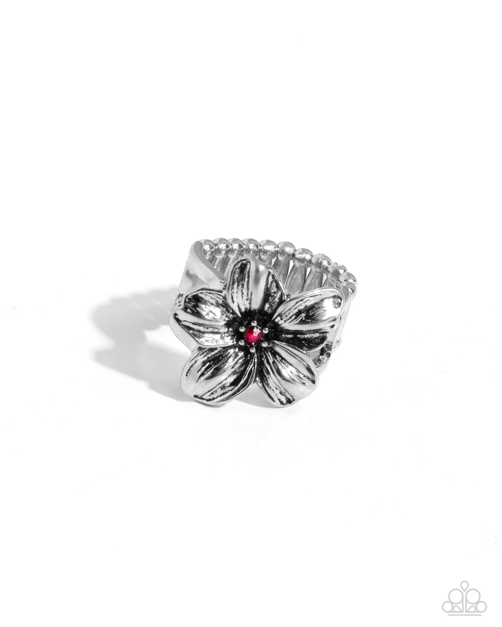 Dotted with dainty silver studs and a dainty siam rhinestone center, folds of shiny silver gather into an oversized tropical flower for a whimsical dash of island inspiration. Two shimmery silver bars arc across the finger, creating an airy band. Features a stretchy band for a flexible fit.