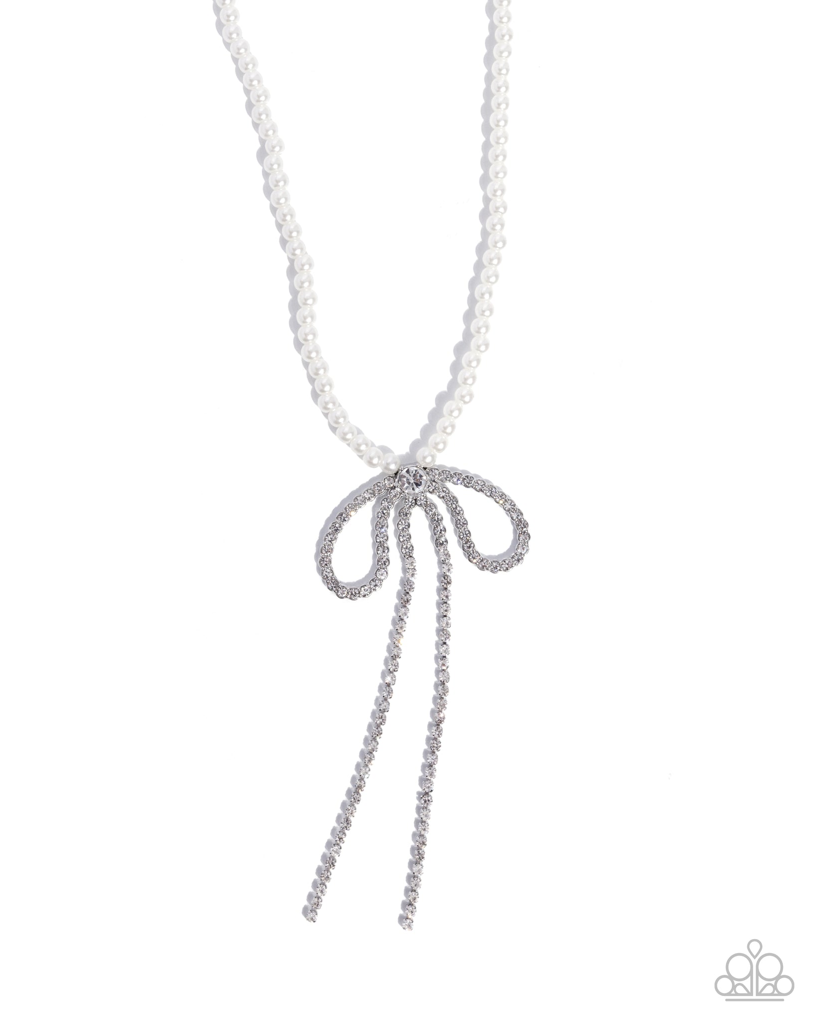 A strand of delicate white pearls drapes below the collar, while a rhinestone-encrusted bow playfully ties the look together at the center. Two glittering tails stream from the bow, adding a show-stopping touch of glittery elegance. Features an adjustable clasp closure.