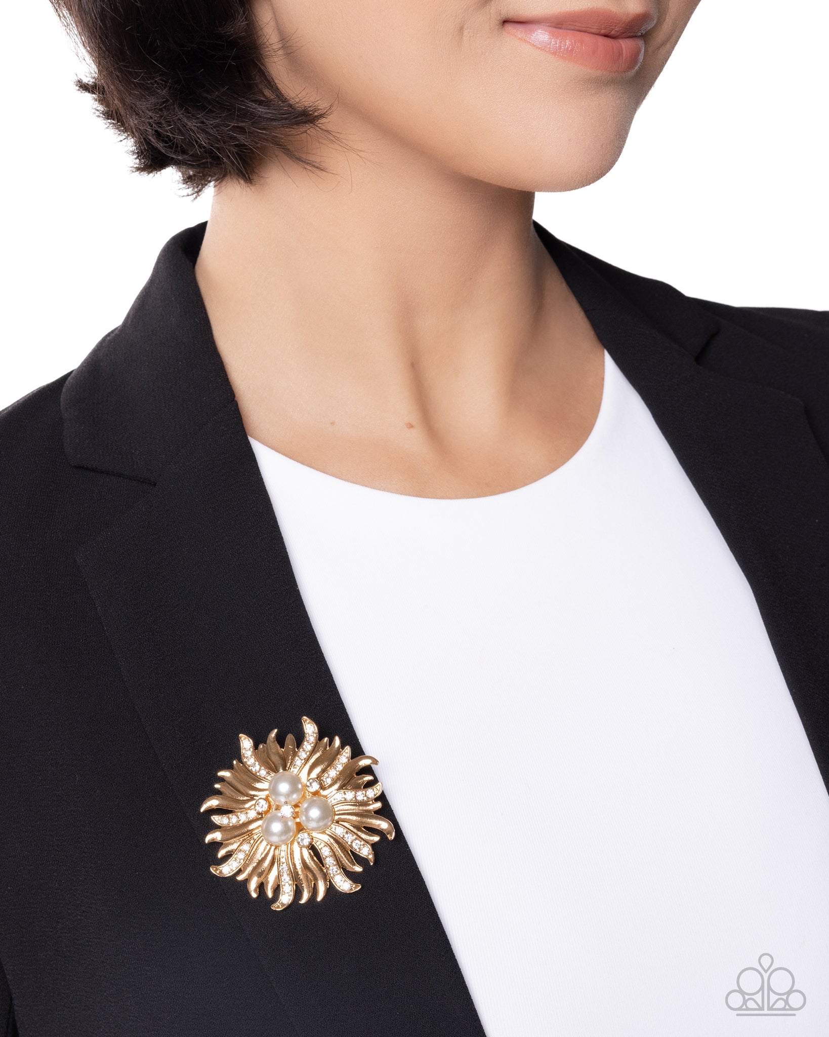 Featuring oversized pearls and white rhinestone detailing, a textured, glistening gold sun stands out for a radiant, refined display. Brooch measures approximately 2" in length and 2" in width.