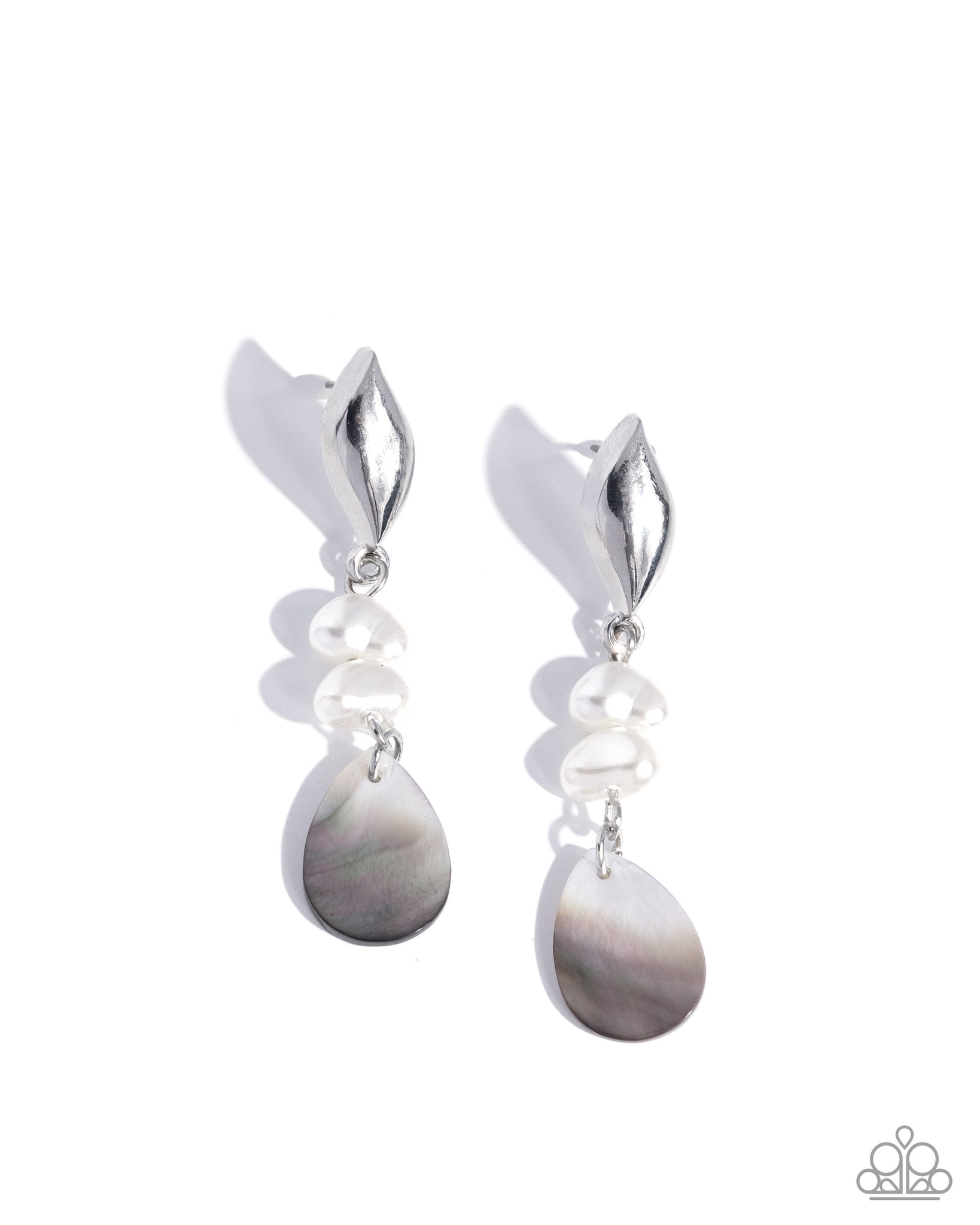 Featuring a high sheen, a glistening silver seashell stands out atop the ear, giving way to a duo of glossy white pearls and a detailed gray teardrop shell for a confidently coastal lure. Earring attaches to a standard post fitting.