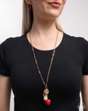 A gold paperclip chain is adorned with a playful collection of charms, including a vibrant red stone heart, a polished baroque pearl, a translucent crystal-like accent, and a textured gold coin. The varied shapes and finishes create a whimsical and stylish statement. Features an adjustable clasp closure. As the stone elements in this piece are natural, some color variation is normal.