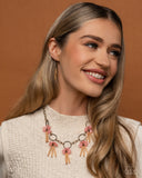 Interrupting a brass paperclip chain, glistening brass rings cascade around the collar. Pink acrylic flowers with a trio of gold filament bars sway from the bottom of the brass rings for a Hawaiian-inspired haute display. Features an adjustable clasp closure.