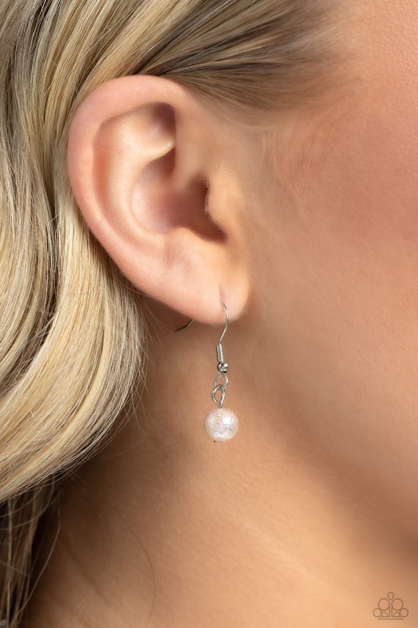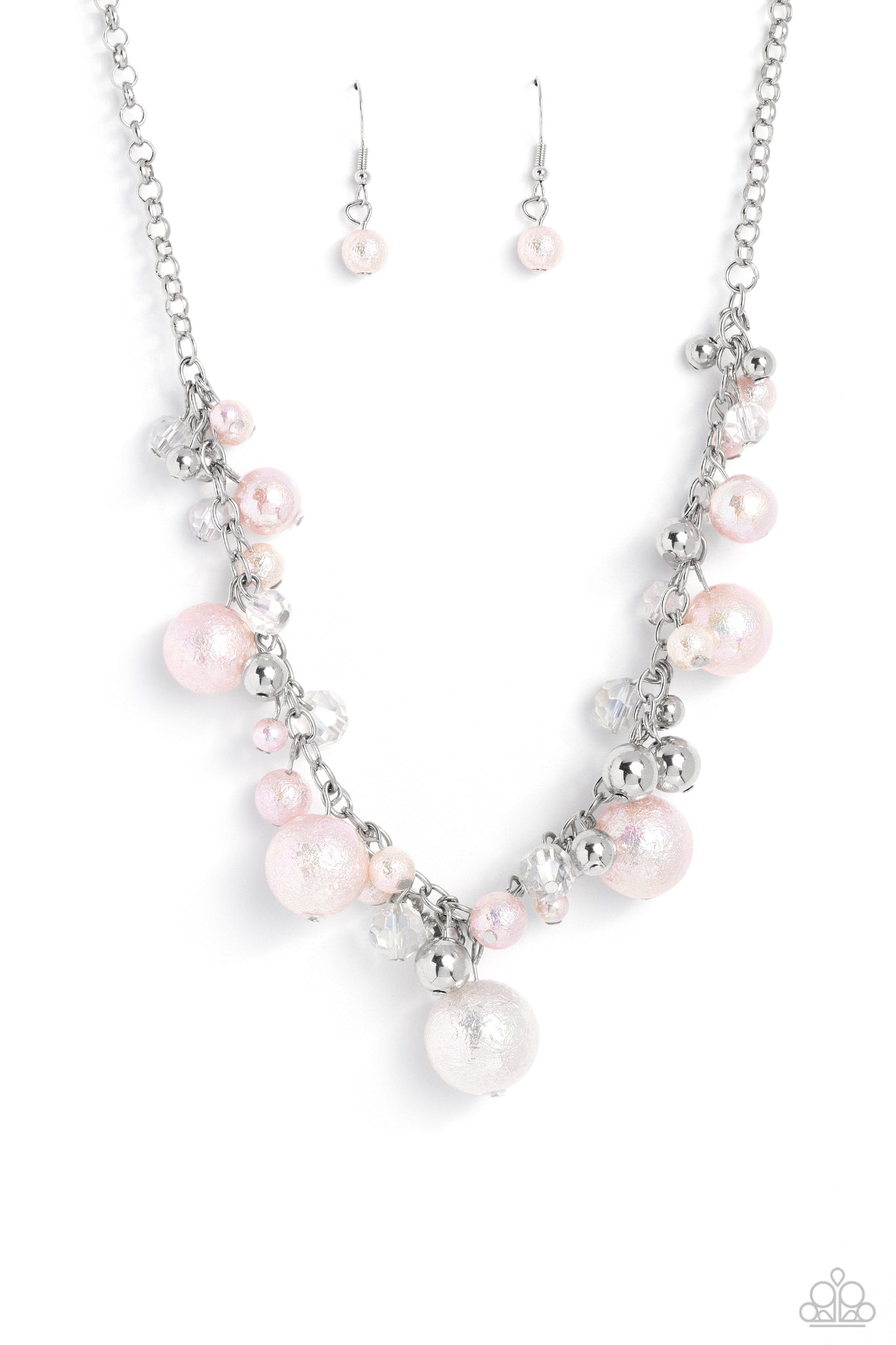 Featuring glassy and polished finishes, pristine baby pink and silver beads cascade from the bottom of a classic silver chain, creating a gorgeous clustered fringe below the collar. Varying sizes of baby pink iridescent beads, featuring a subtle scratch surface, add a refined shimmer to the clustered display for a gorgeous effect. Features an adjustable clasp closure. Due to its prismatic palette, color may vary.