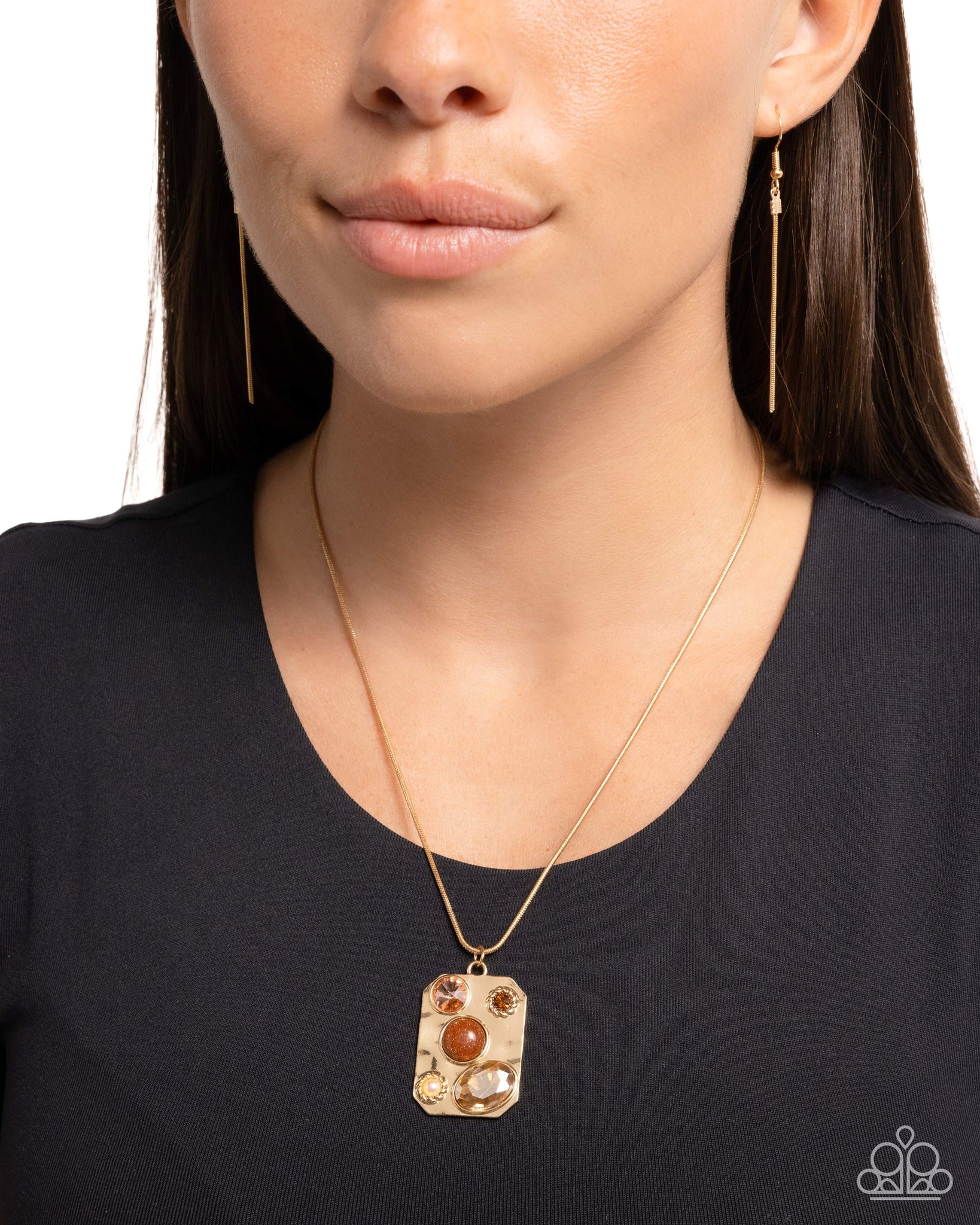 Gliding along a dainty gold snake chain, a hammered rectangular gold pendant features a collection of eclectic shimmer including peach round and light topaz oval gems, a white pearl in a textured wreath, a topaz rhinestone in the same textured wreath, and a gold-flecked brown bead. Features an adjustable clasp closure.