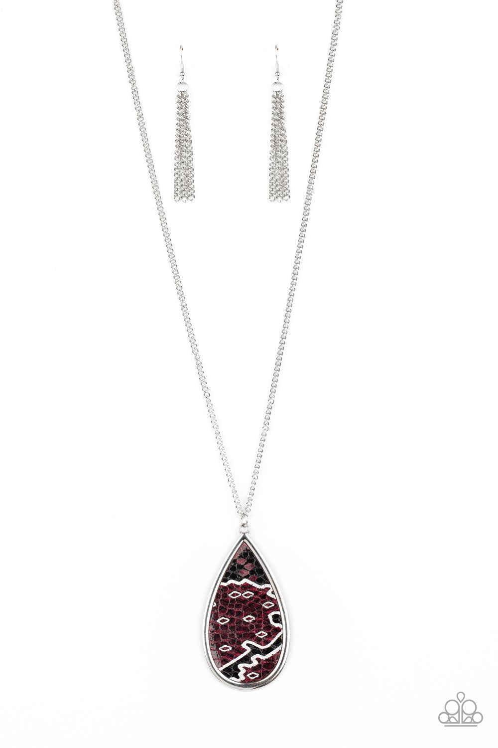 Featuring a metallic scale print, a piece of purple leather embellishes the center of an oversized silver teardrop at the bottom of a lengthened silver chain for a wild look. Features an adjustable clasp closure.