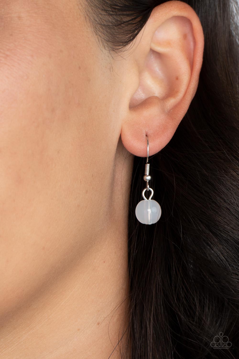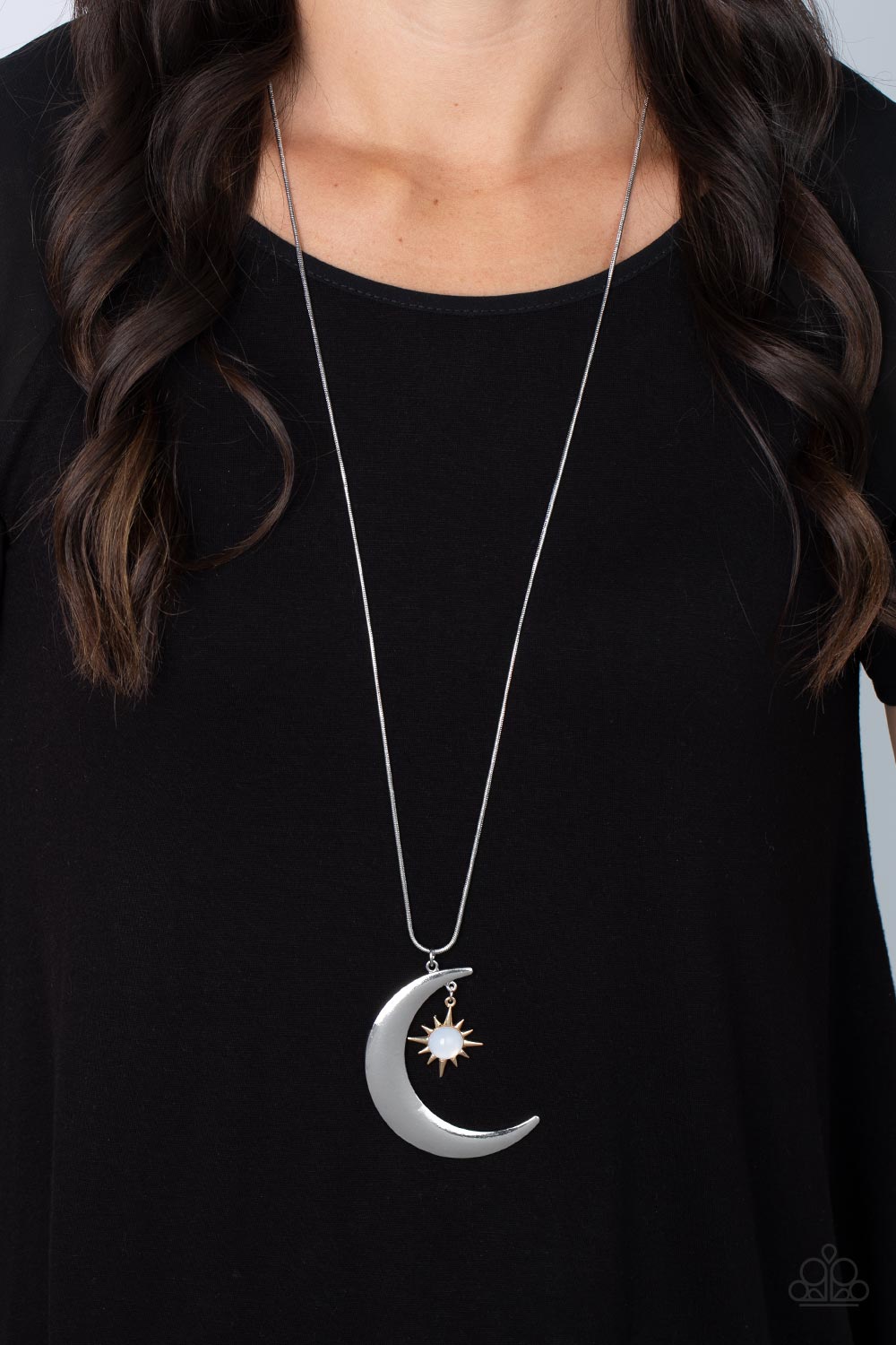 An opaque white bead is pressed into the center of a gold star that dances from the top of a silver half moon pendant, creating a celestial pendant at the bottom of a lengthened silver snake chain. Features an adjustable clasp closure.