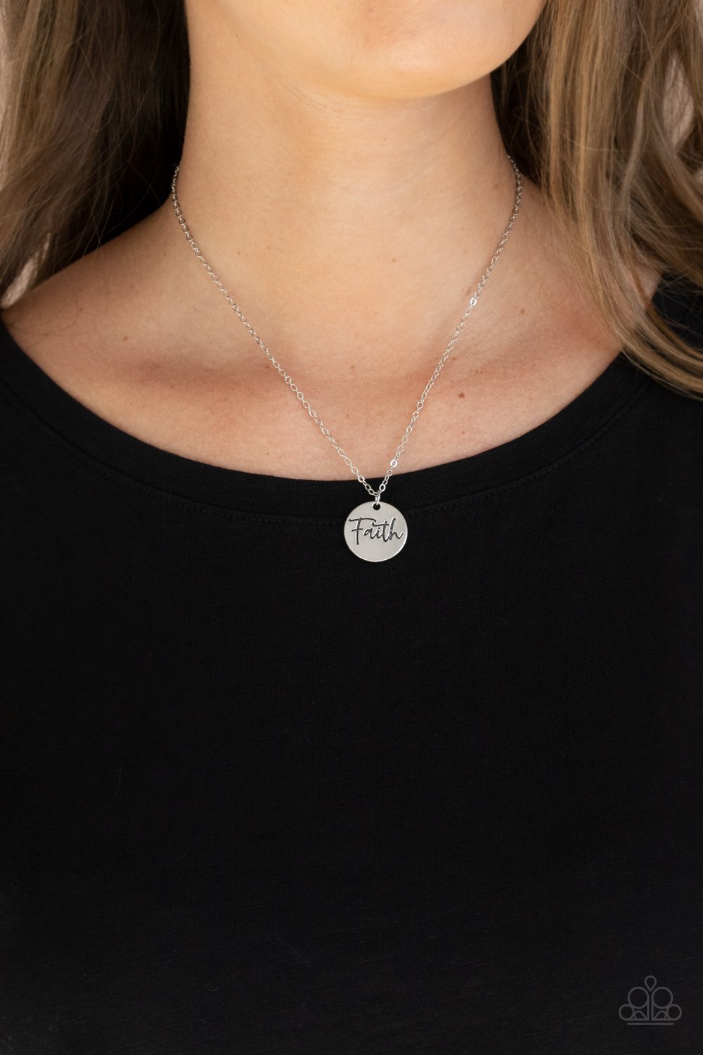 A dainty silver disc is stamped in the word, "Faith," at the bottom of a shiny silver chain, creating an inspiring pendant below the collar. Features an adjustable clasp closure.