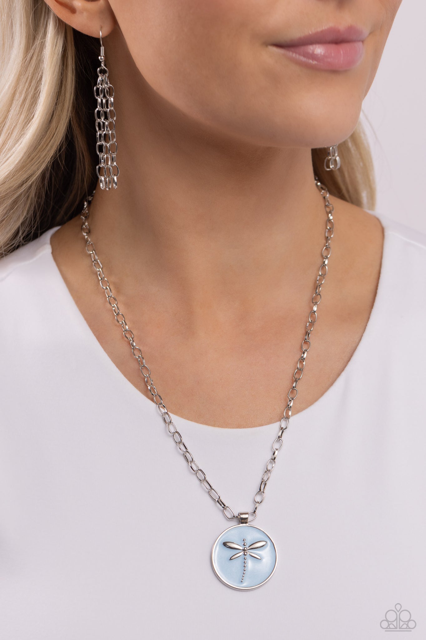 Featuring a light blue pearl paint backdrop, a silver dragonfly dances at the center of a silver pendant adding an elegantly rugged aesthetic to a silver link chain. Features an adjustable clasp closure.