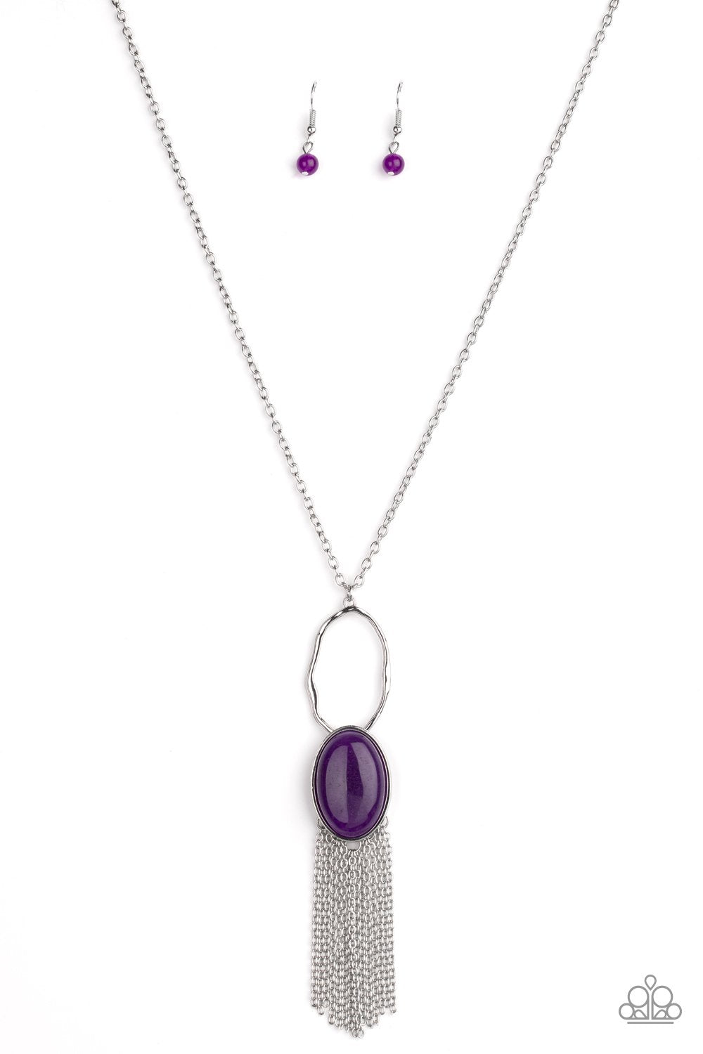 Nestled in a sleek silver frame, a dewy purple stone swings from the bottom of a hammered silver hoop at the bottom of a shiny silver chain. Dainty silver chains stream from the bottom of the tranquil stone pendant, creating a whimsical tassel. Features an adjustable clasp closure.