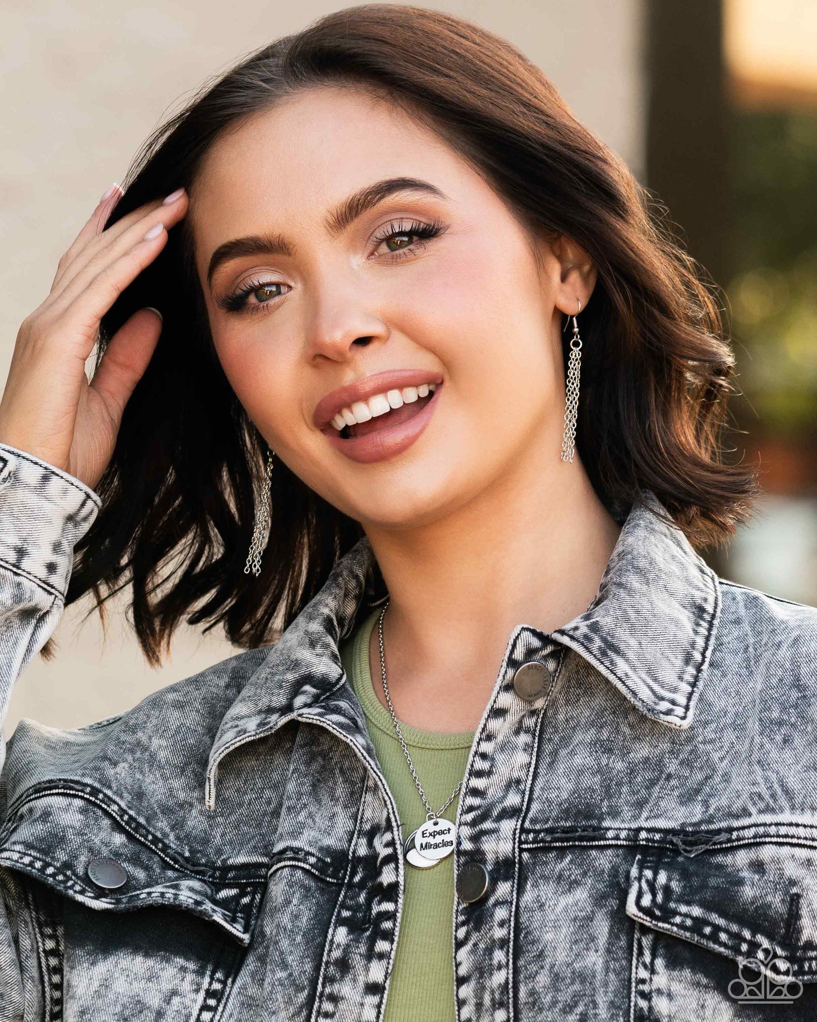 Gliding along a glistening silver chain, a silver pendant with the phrase "Expect Miracles" layers next to a silver mountain-outlined pendant with a white-painted cloud atop it. A mustard seed, encased in a clear case over the mountain shape forms a moon for an inspirational finish. Features an adjustable clasp closure.