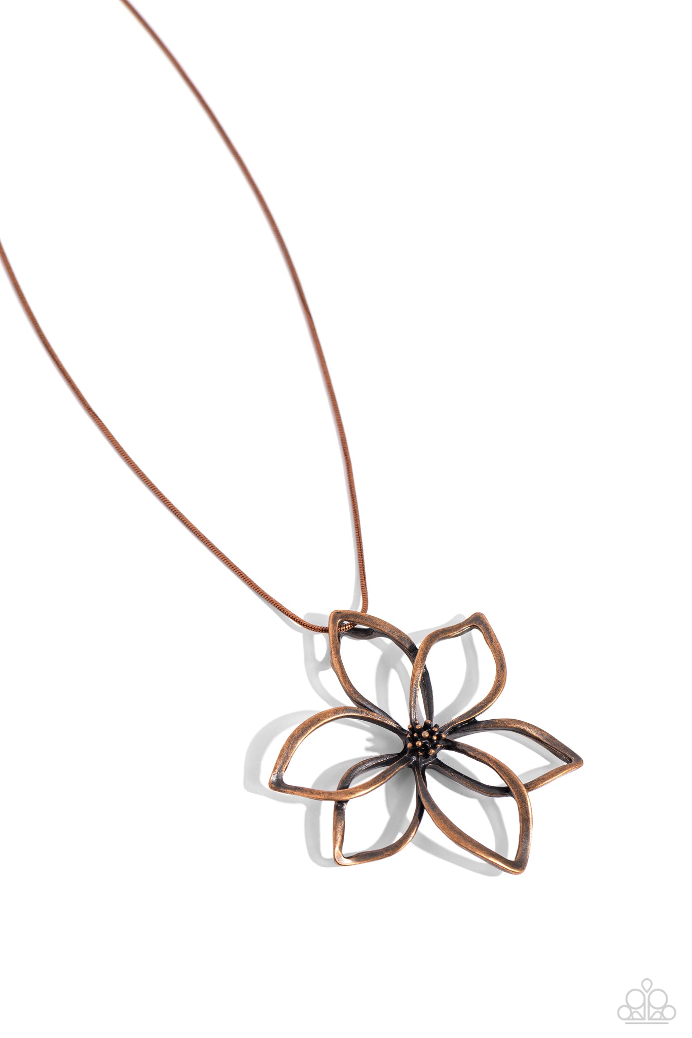 Gliding from an elongated copper snake chain, airy copper petals layer and flare out from a copper stud-embellished center to create a whimsically dainty flower. Features an adjustable clasp closure.