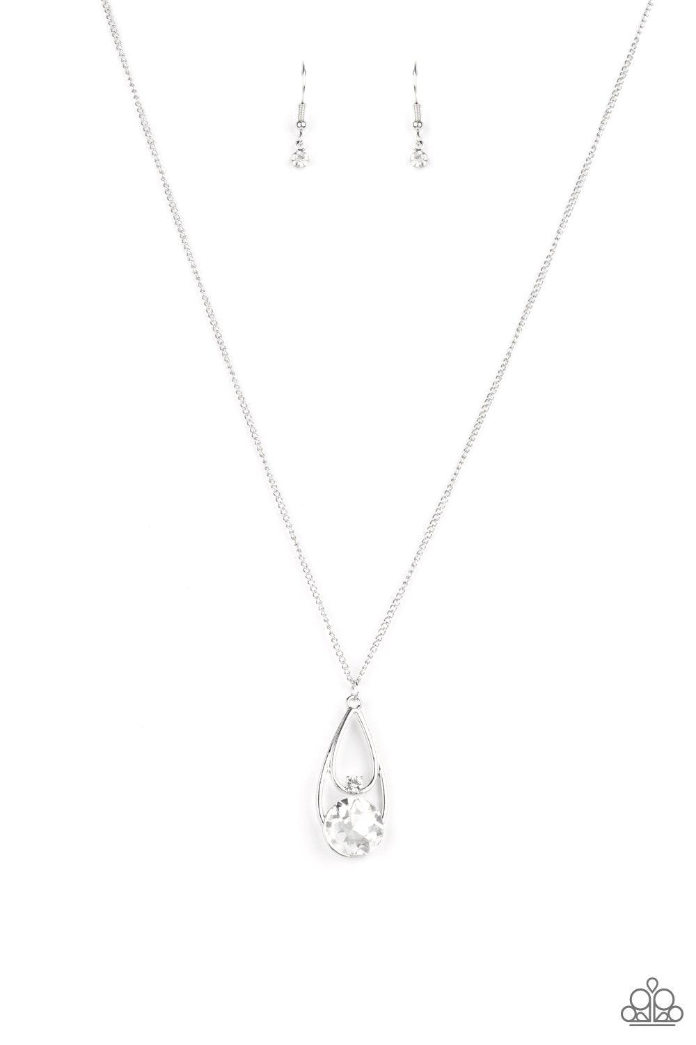 Two silver teardrops delicately overlap in a solitaire pendant at the bottom of a shiny silver chain. A dainty white rhinestone dots the bottom of the highest teardrop, while an oversized white gem adorns the lowermost teardrop, coalescing into a sparkly centerpiece. Features an adjustable clasp closure.