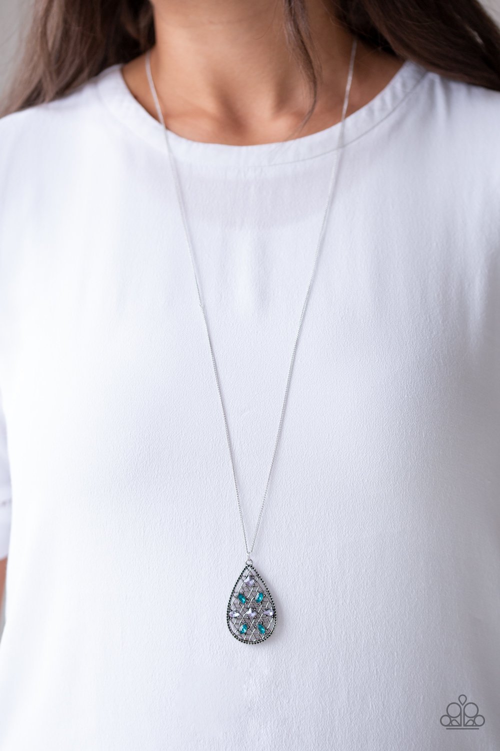 Dotted in a variety of multicolored rhinestones, a silver teardrop pendant swings from the bottom of a lengthened silver chains for a refined look. Features an adjustable clasp closure.