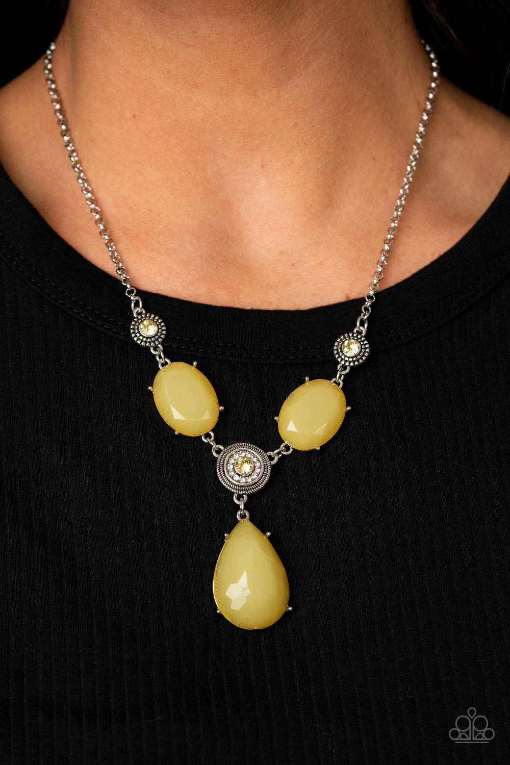 A collection of yellow and white rhinestone dotted silver frames link with a pair of dewy yellow oval gems below the collar. A dramatically oversized dewy yellow teardrop drips from the center, creating a glamorous pendant. Features an adjustable clasp closure.