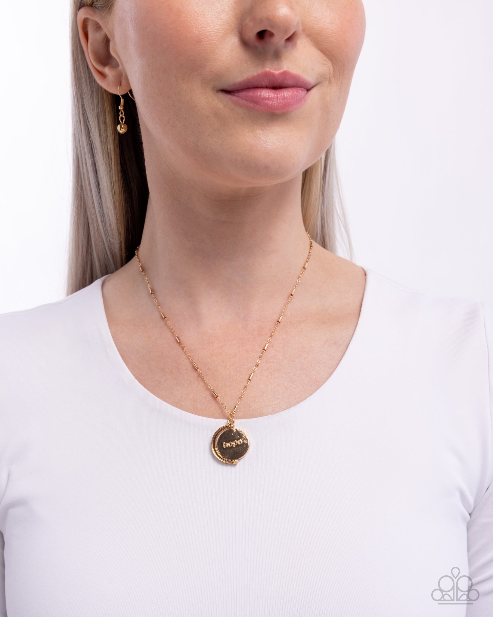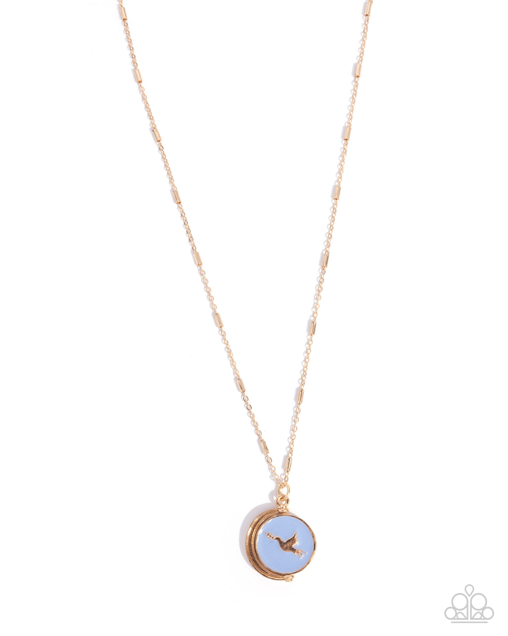 A dainty gold chain adorned with cylindrical metal bars give way to a circular pendant, featuring a light blue background and a gold embossed bird on one side, and the word "hope" on the other side. The minimalist design offers a chic and graceful look as the pendant can twist to either design. Features an adjustable clasp closure.