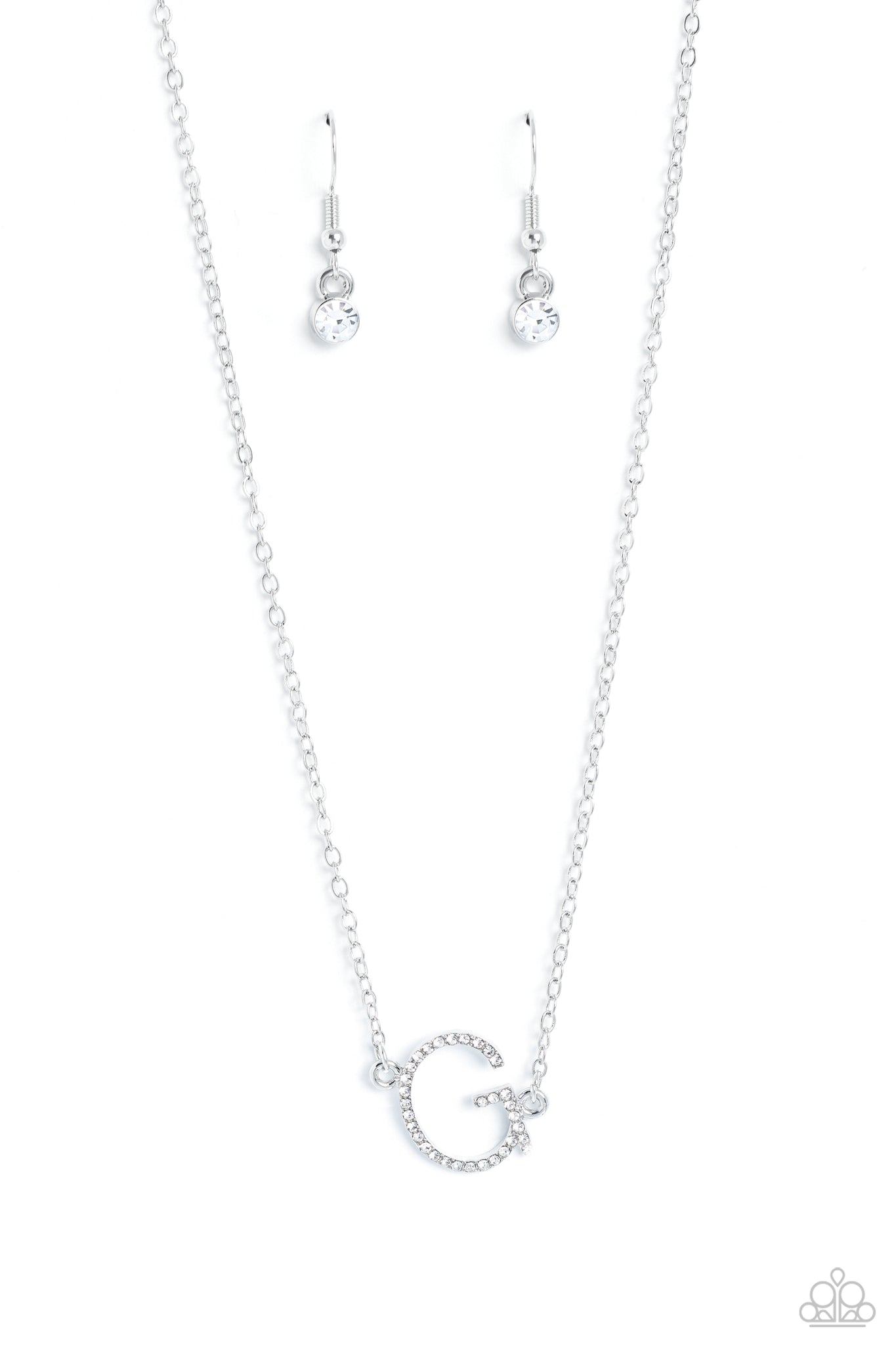 Embossed with dainty white rhinestones, a silver letter "G" hovers below the collar from a dainty silver chain, for a sentimentally simple design. Features an adjustable clasp closure.