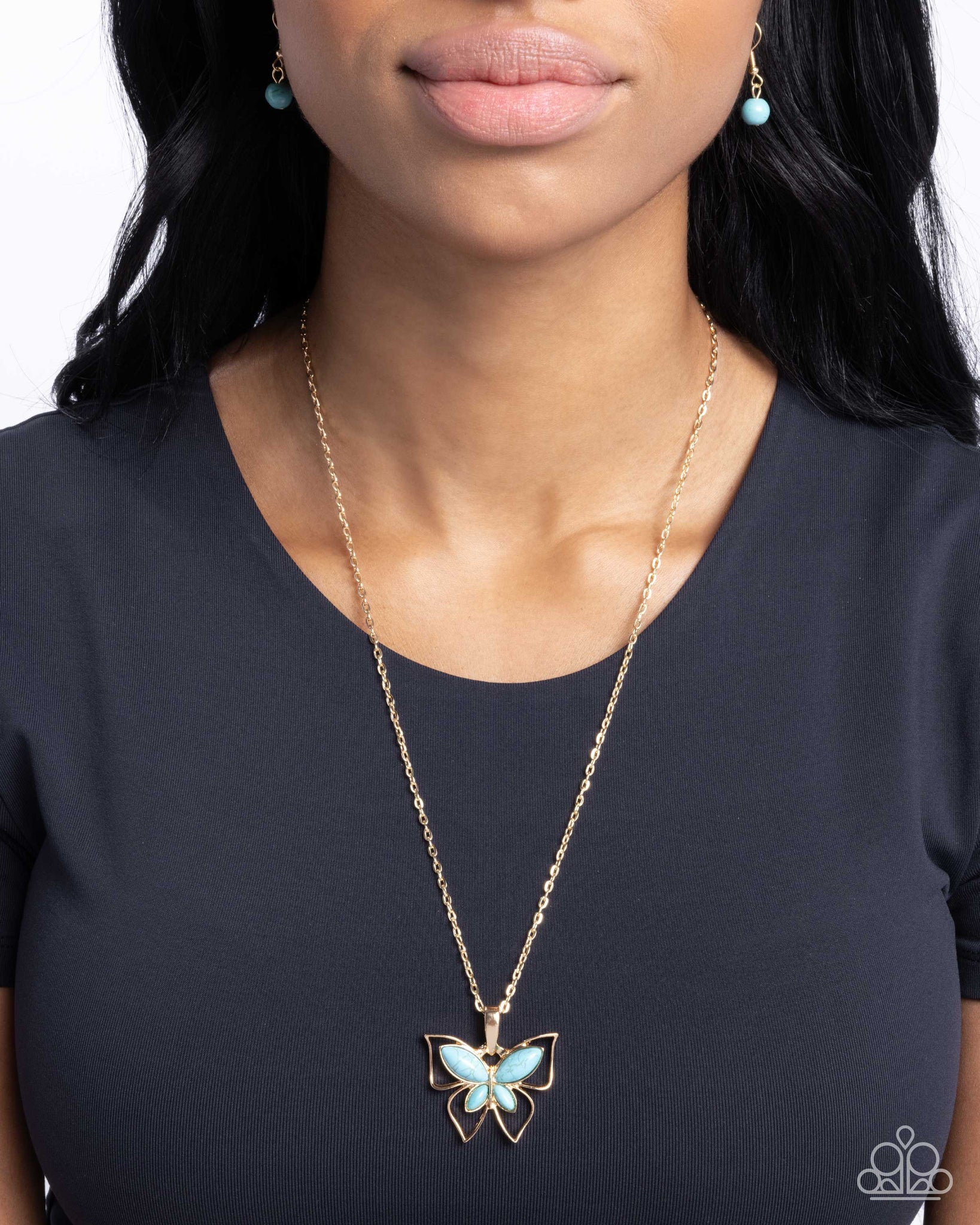 Pressed in an airy gold butterfly frame, a turquoise stone butterfly flutters from a dainty gold chain for a whimsically layered display. Features an adjustable clasp closure. As the stone elements in this piece are natural, some color variation is normal.
