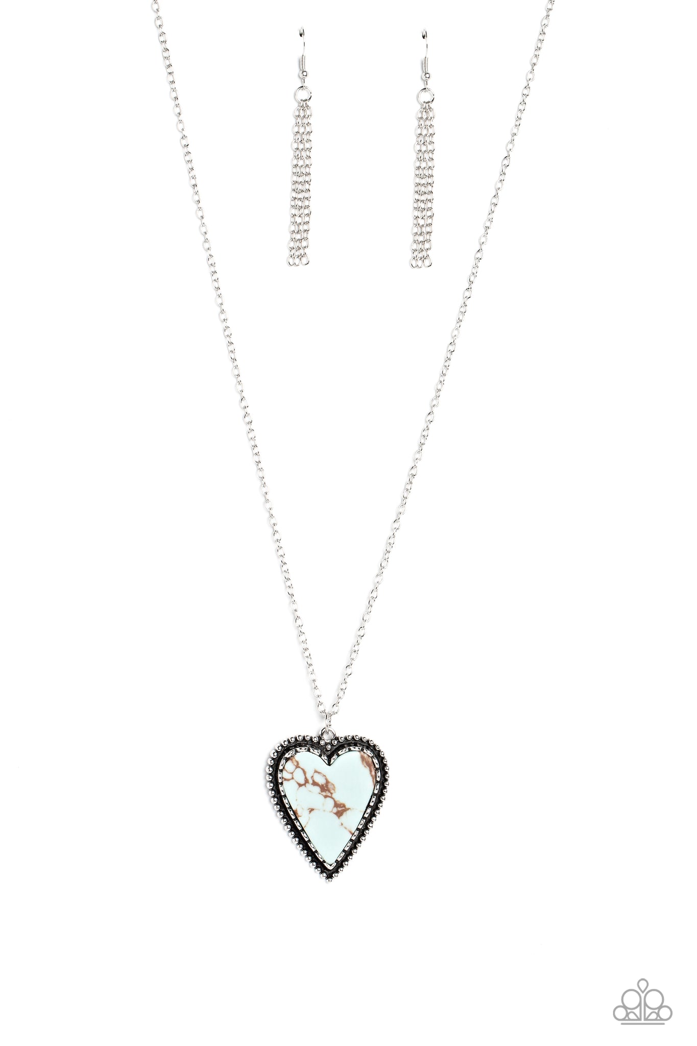 Pressed in the center of a silver chain and studded frame, an oversized, blue marbled stone heart pendant rustically falls down the chest from a classic silver chain. Features an adjustable clasp closure. As the stone elements in this piece are natural, some color variation is normal.