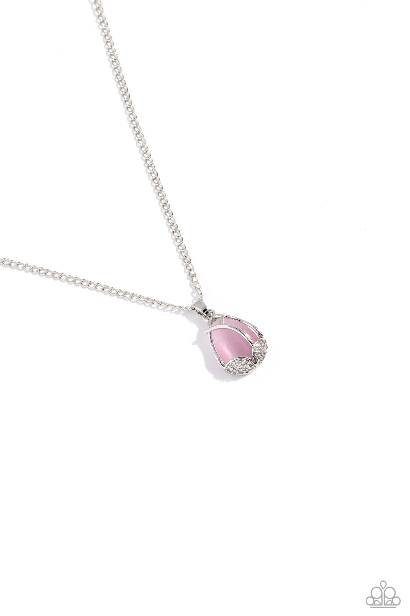 Dotted in dainty silver studs and glittery white rhinestones, leafy silver frames delicately fold around the bottom of a pink cat's eye stone teardrop, resulting in an ethereal pendant below the collar. Features an adjustable clasp closure.