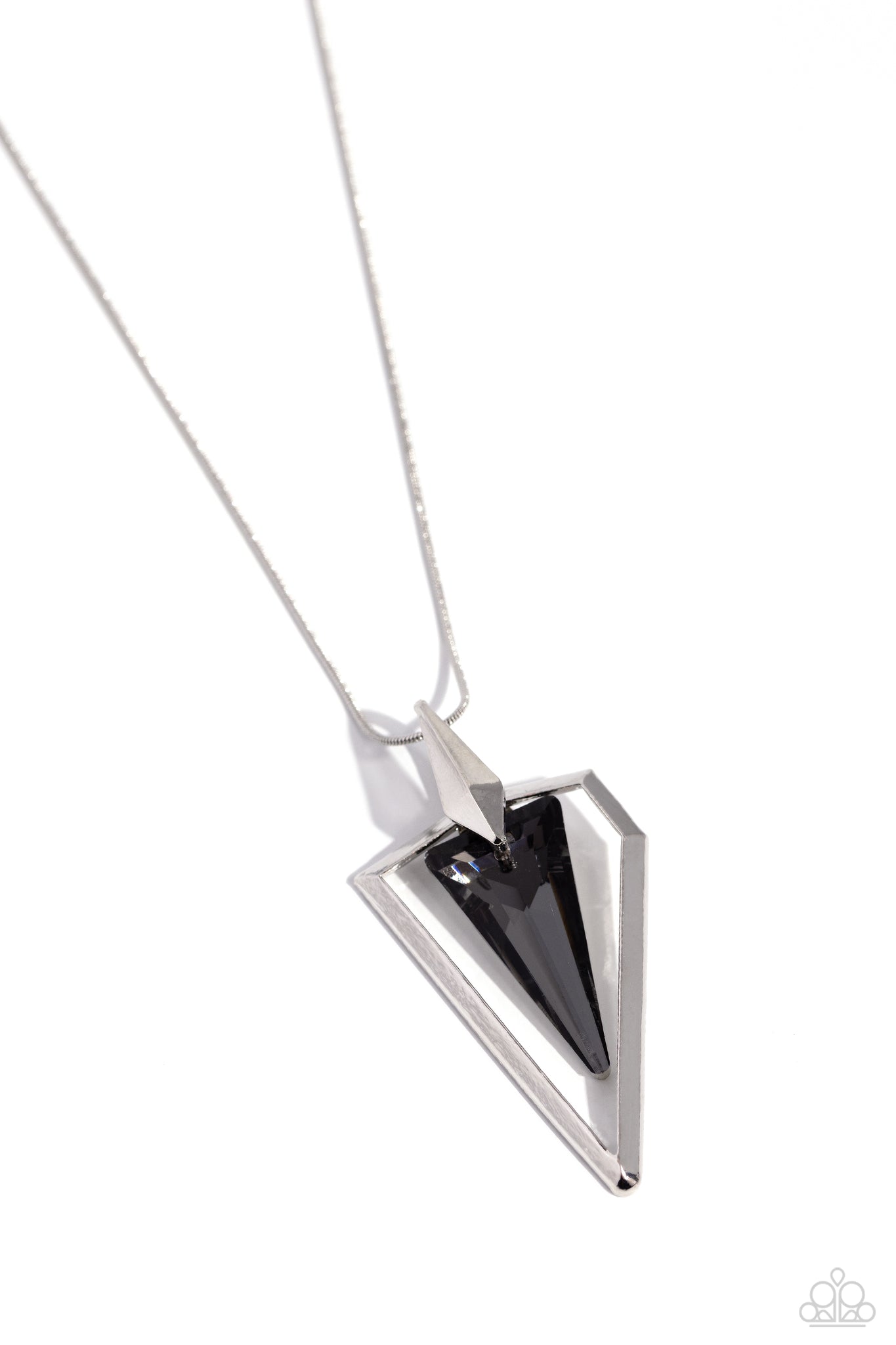 Featuring a double-sided design, a faceted, oversized smoky and silver gem triangle is displayed from an oversized abstract silver triangular frame along an extended silver snake chain for an edgy display. Features an adjustable clasp closure.