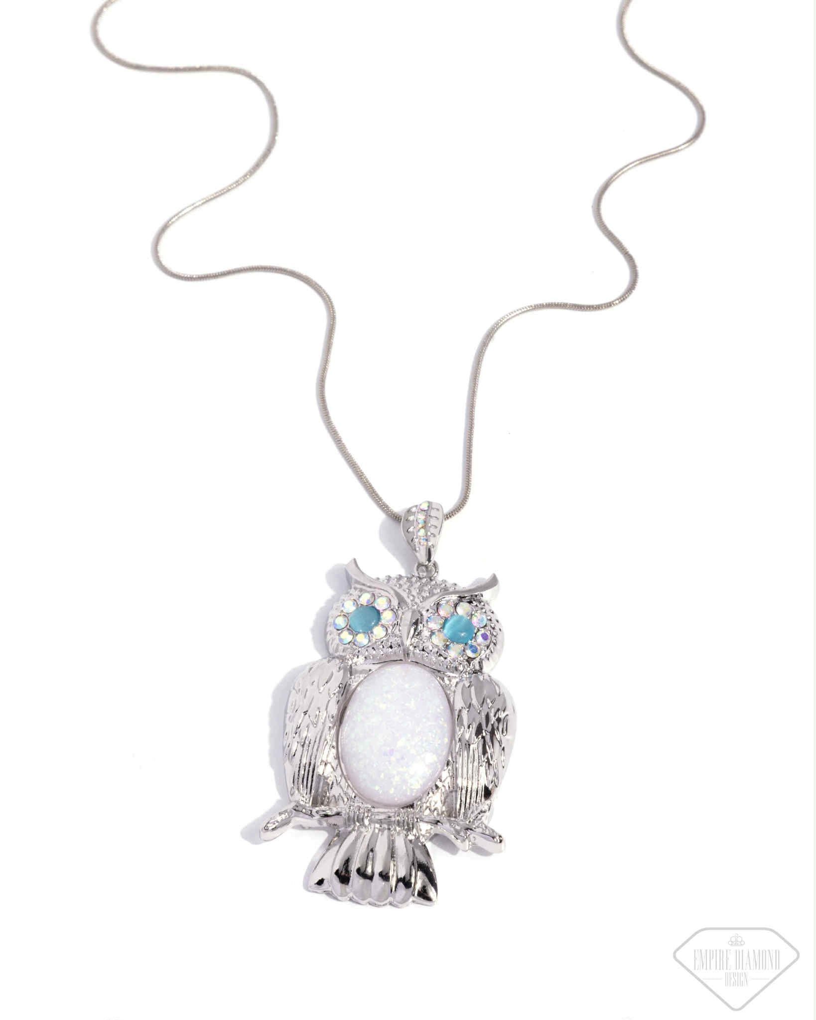 A shimmery white bead infused with flecks of iridescence forms the body of a tactile-textured oversized silver owl, complete with iridescent and UV-shimmery eyes perched atop a textured silver branch. The owl gives way from an iridescent rhinestone-dotted silver leaf bail clasp that slides effortlessly along a thin silver snake chain, creating a wildly whimsical pendant. Features an adjustable clasp closure. Due to its prismatic palette, color may vary.