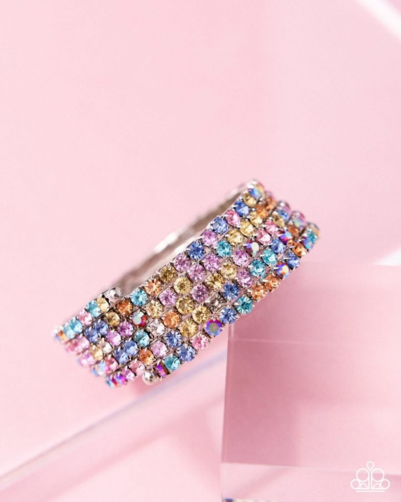 Encased in sleek silver fittings, row after row of glassy multicolored and iridescent rhinestones coil around the wrist, creating a blinding infinity wrap bracelet. Due to its prismatic palette, color may vary.