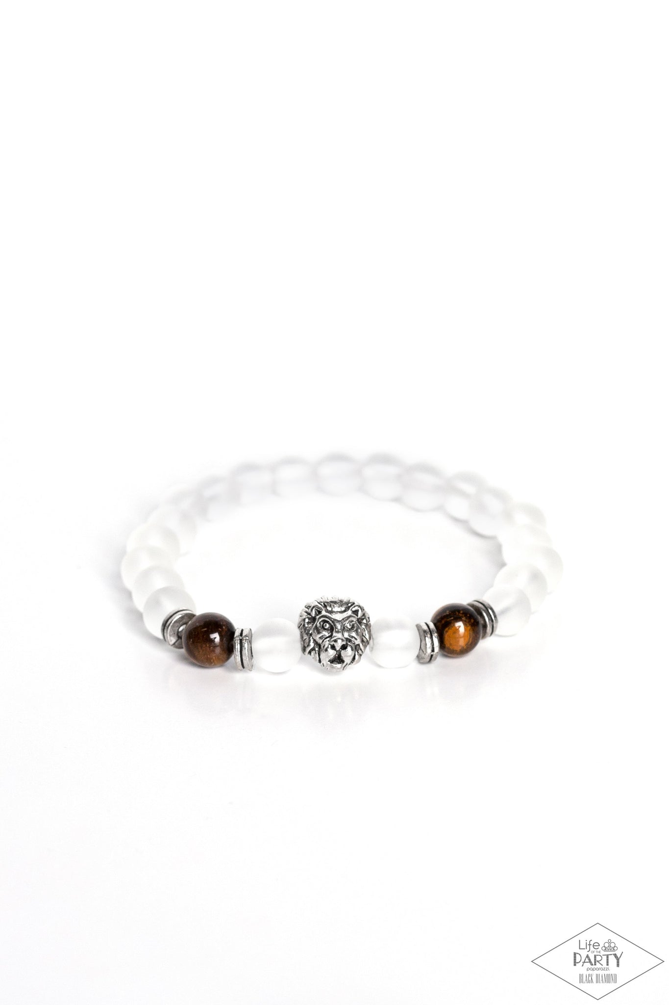 Adorned with a silver lion charm, glassy white and energetic tiger's eye stones are threaded along a stretchy elastic band for a seasonal look.