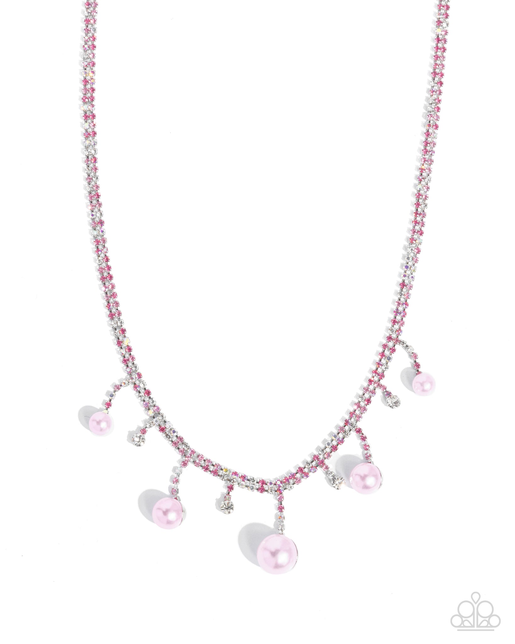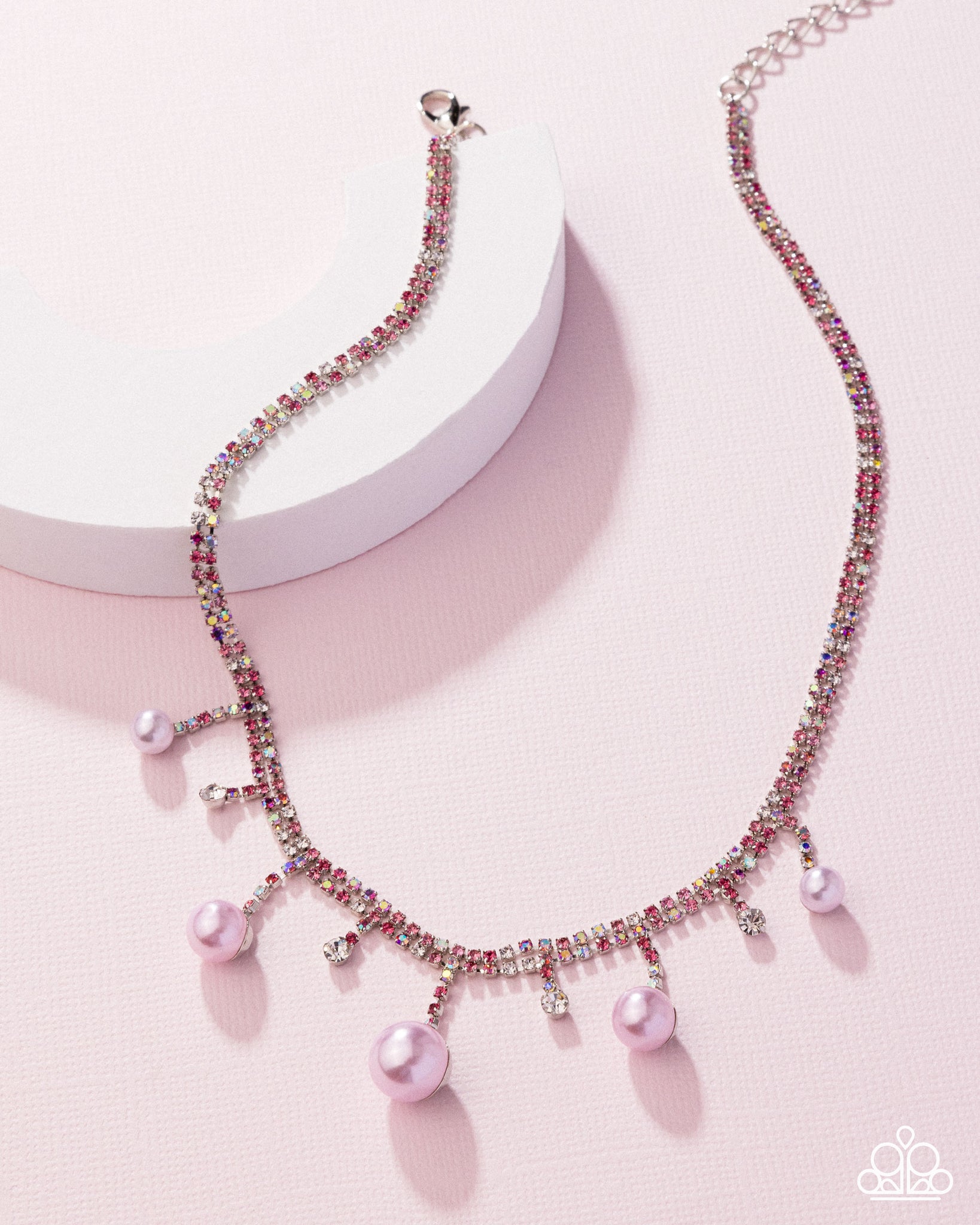 A doubled strand of various dainty pink multicolored and pink iridescent rhinestones in dainty square fittings coalesce around the collar. Faceted white gems alternate with baby pink pearls in varying sizes as they drip from the dazzling row above from additional strands of pink multicolored rhinestones in square fittings for a ritzy finish. Features an adjustable clasp closure. Due to its prismatic palette, color may vary.