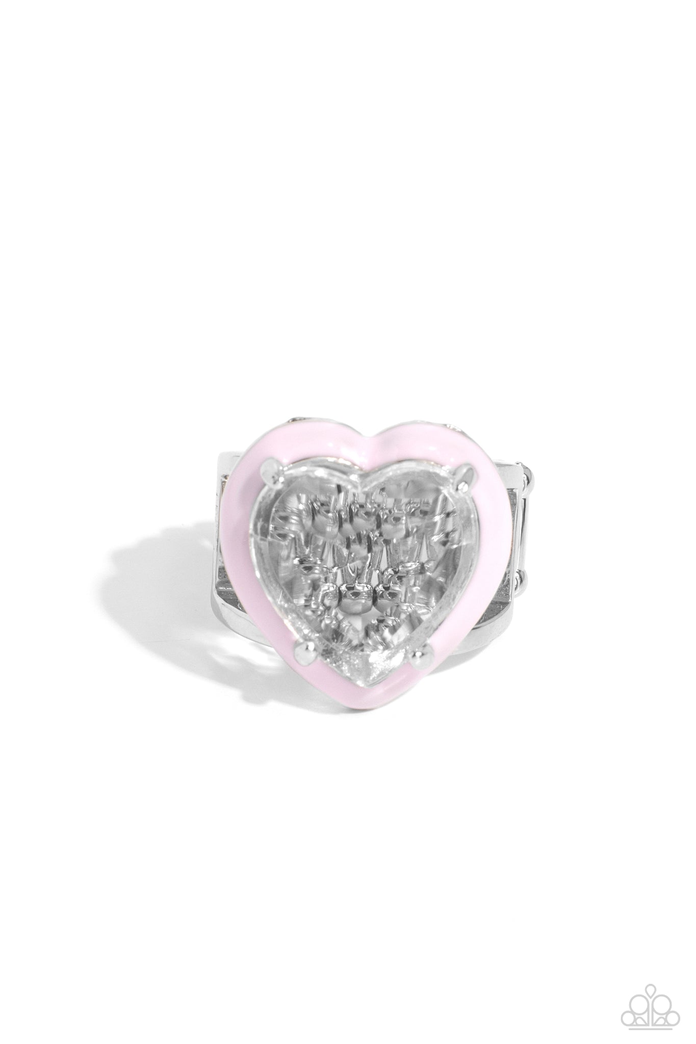 A faceted crystal-like white heart gem is pressed into pronged-fittings atop airy silver bands. A border of light pink paint encircles the dazzling heart for a romantic centerpiece atop the finger. Features a stretchy band for a flexible fit.