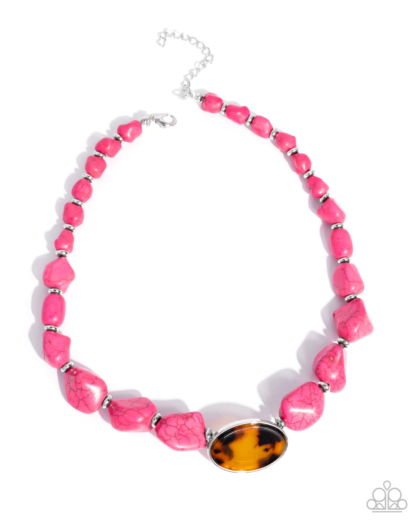 Chunky pink stone beads with natural veining create a bold and vibrant design below the collar. Each stone is separated by sleek silver beads, adding a touch of metallic contrast. A large oval tortoiseshell-inspired centerpiece anchors the necklace, introducing a hint of earthy elegance to the vibrant stones. Features an adjustable clasp closure. As the stone elements in this piece are natural, some color variation is normal.