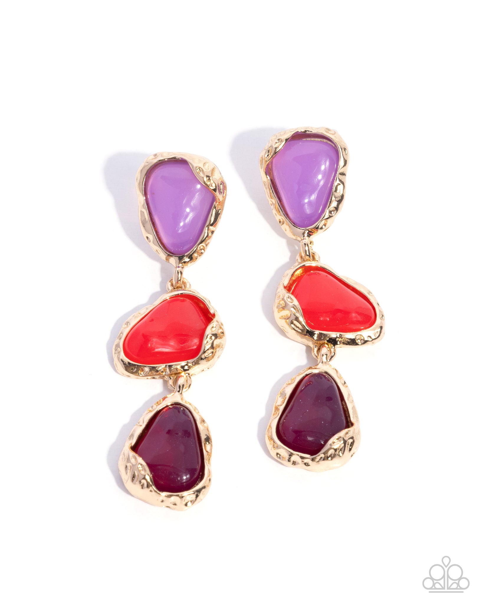 Pressed in hammered, abstract, thick gold frames, a collection of Lavender, Winterberry, and Damson acrylics in varying shapes coalesces below the ear for a colorfully chic lure. Earring attaches to a standard post fitting.