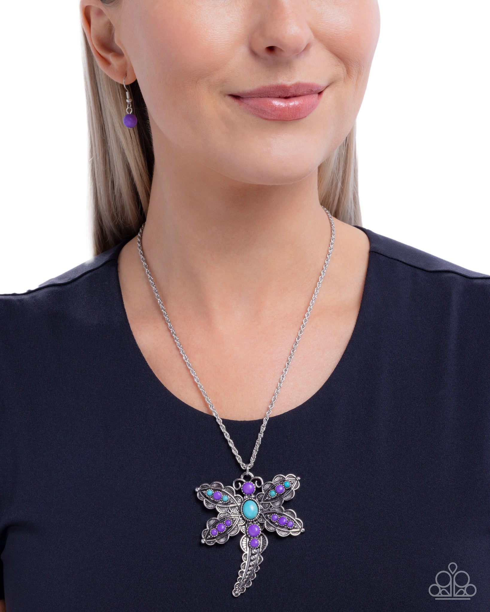 Featuring scalloped detailing, a silver-studded, turquoise and amethyst stone-dotted oversized silver dragonfly flutters below the neckline from a classic silver chain for a wildly whimsical display. Features an adjustable clasp closure. As the stone elements in this piece are natural, some color variation is normal.