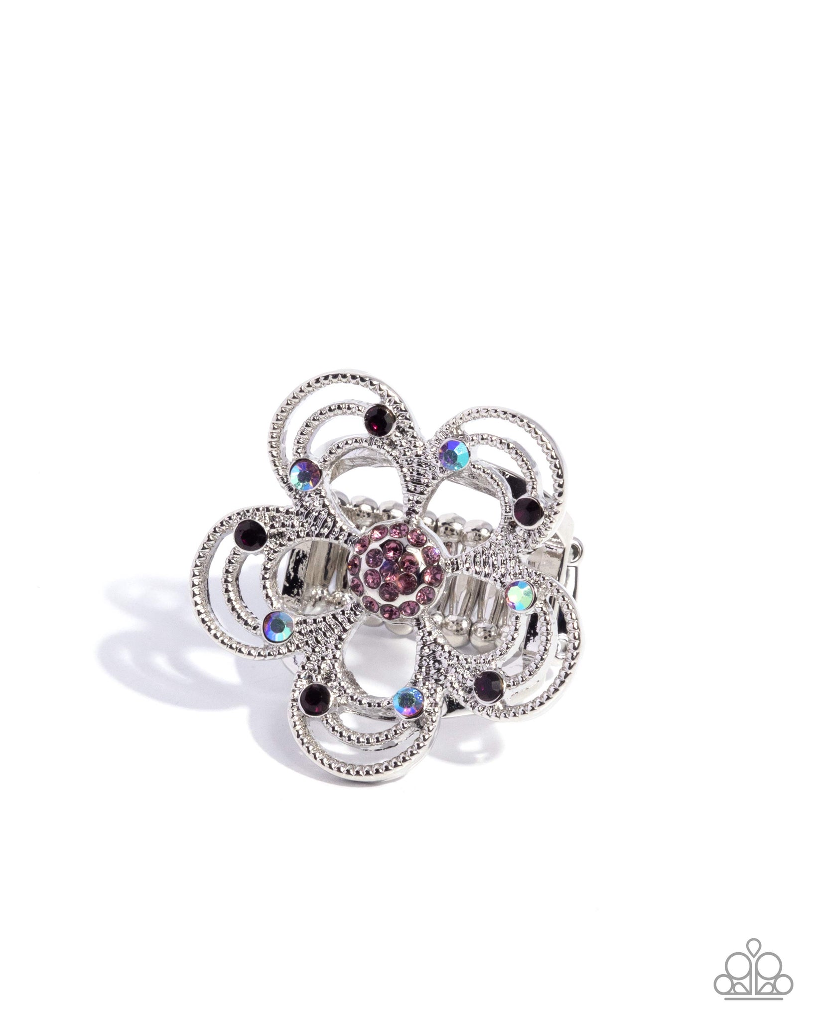 Sporadically dotted with light amethyst, amethyst, and light amethyst iridescent rhinestones, a stud-layered three-dimensional silver flower blooms atop the finger on airy silver bands around an amethyst rhinestone-embellished centerpiece for a whimsical pop of color. Features a stretchy band for a flexible fit. Due to its prismatic palette, color may vary.