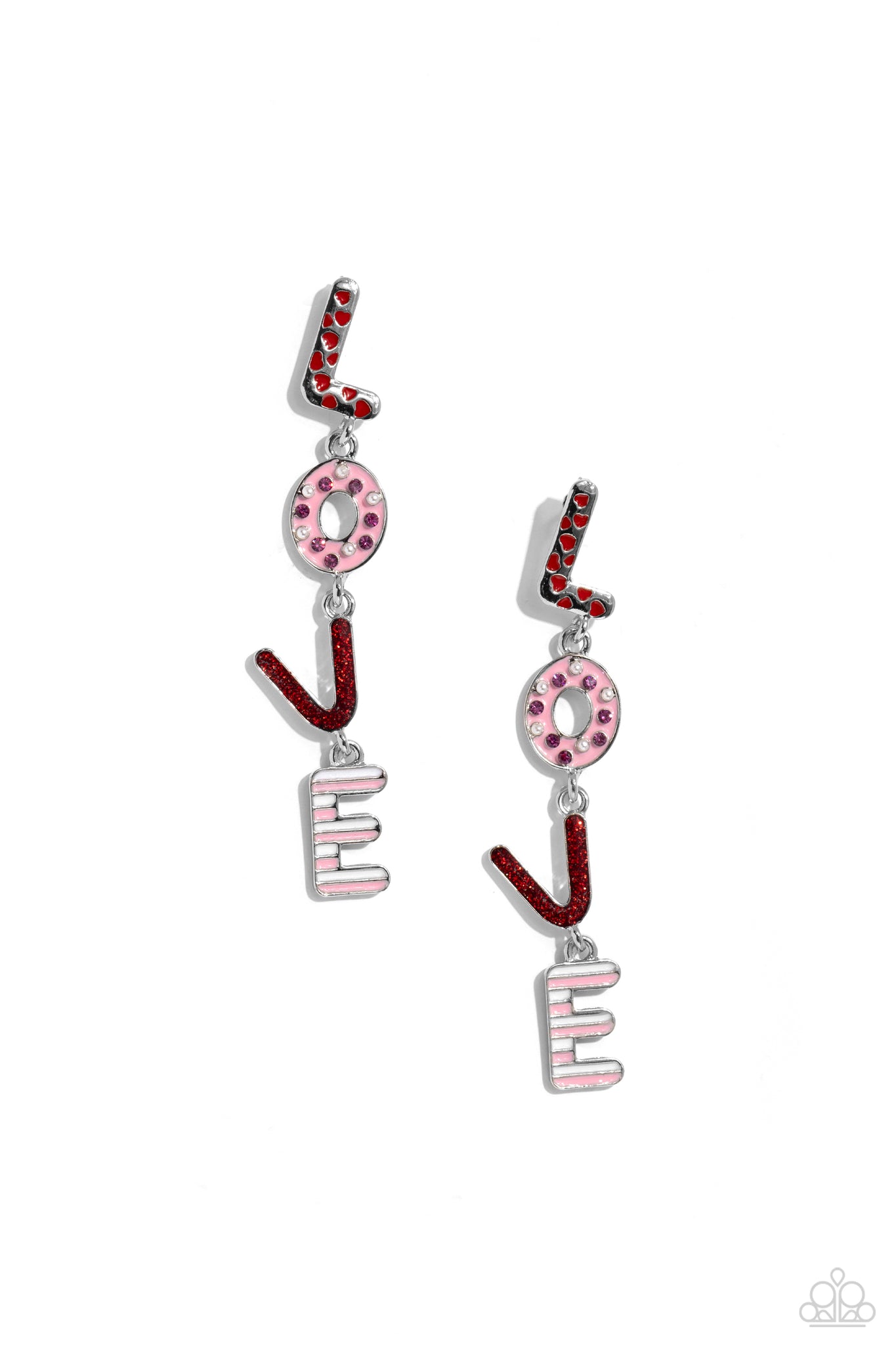 Silver letters with various Valentine's-inspired details spell out the word "LOVE" as they vertically cascade down the ear in a flattering finish. The "L" features red-painted hearts, the "O" features a baby pink background with fuchsia rhinestones and dainty white pearls, the "V" features a red glitter backdrop, and the "E" features stripes of white and baby pink. Each of the letters are interconnected to one another, infusing the design with some playful movement. Earring attaches to a standard post fitting.